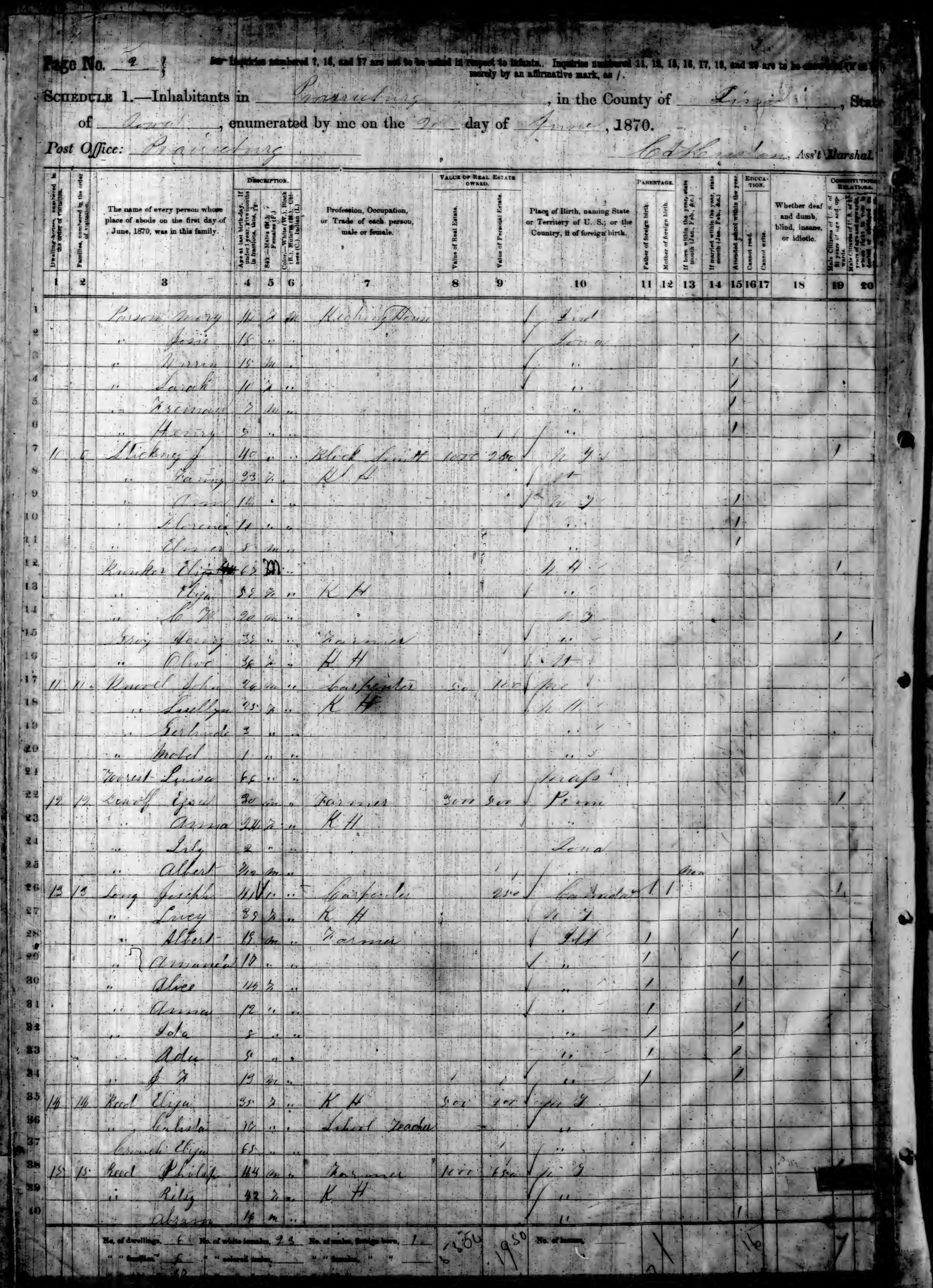 Ancestry.com Operations, Inc., 1870 United States Census, Prairieburg, Linn, IA, page 1B, dwelling 9, family 9, line 1, Parson, Mary; Database and images, Ancestry.com LLC, Ancestry.com : 2009 (http://www.Ancestry.com/ : accessed 09/15/2021); citing Ninth Census of the United States, 1870 U. S. Census, population schedules, National Archives and Records Administration Microfilm Publication M593 (1761 rolls), Records of the Bureau of the Census, Record Group 29, National Archives, Washington, DC, roll 405, image 52 [Surety: 3]. |