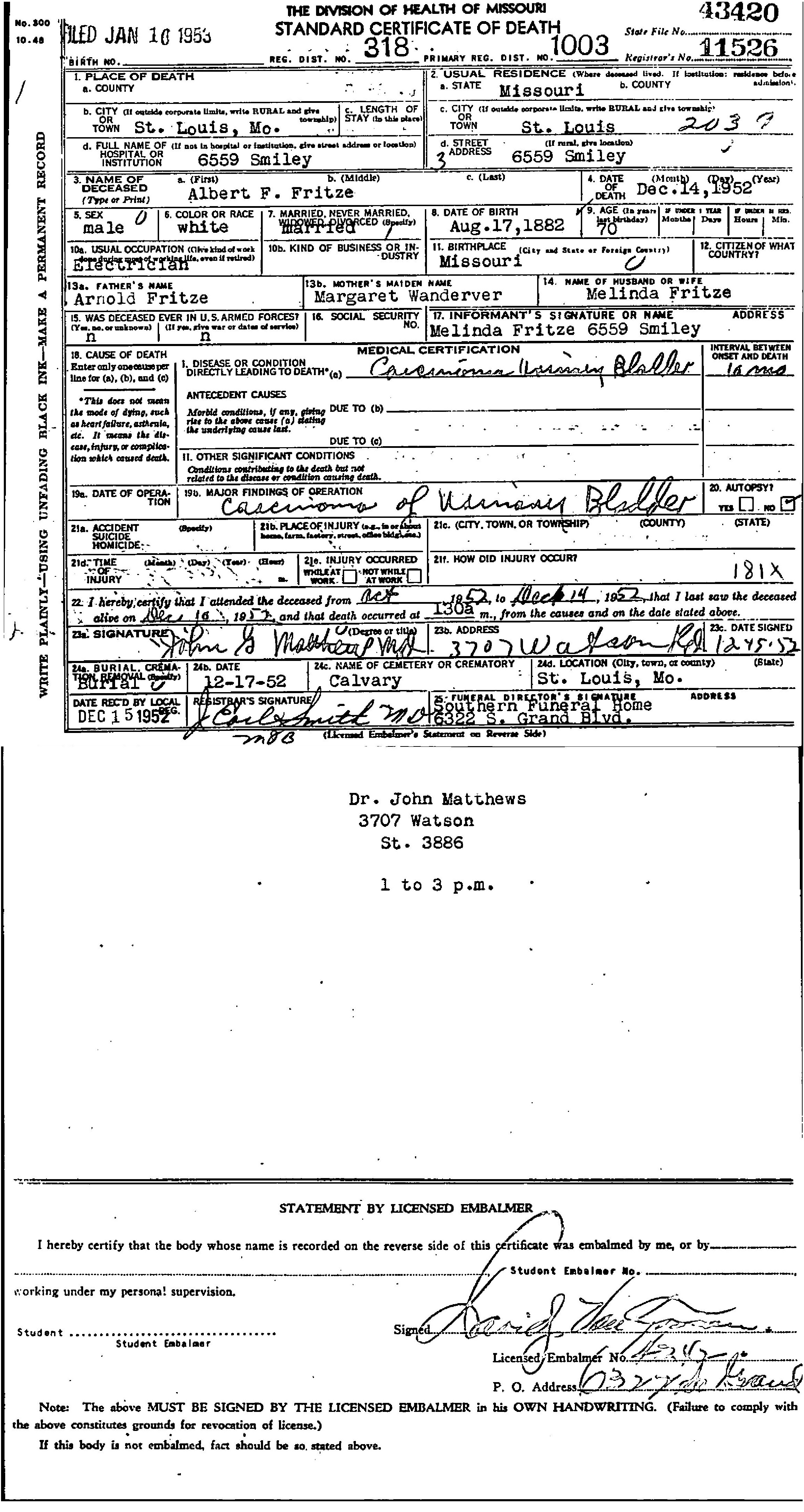 Ancestry.com Operations, Inc., Web: Missouri Death Certificates 1910-1962, St Louis City certificate 1952-043420, Albert F Fritze; Database online, Ancestry.com LLC, Ancestry.com : 2015 (http://www.Ancestry.com/ : accessed 09/16/2019); citing Missouri Death Certificates, Missouri Secretary of State, Missouri Digital Heritage, Database and images, https://www.sos.mo.gov/images/archives/deathcerts/1920/1920_00019419.PDF [Surety: 3]. |