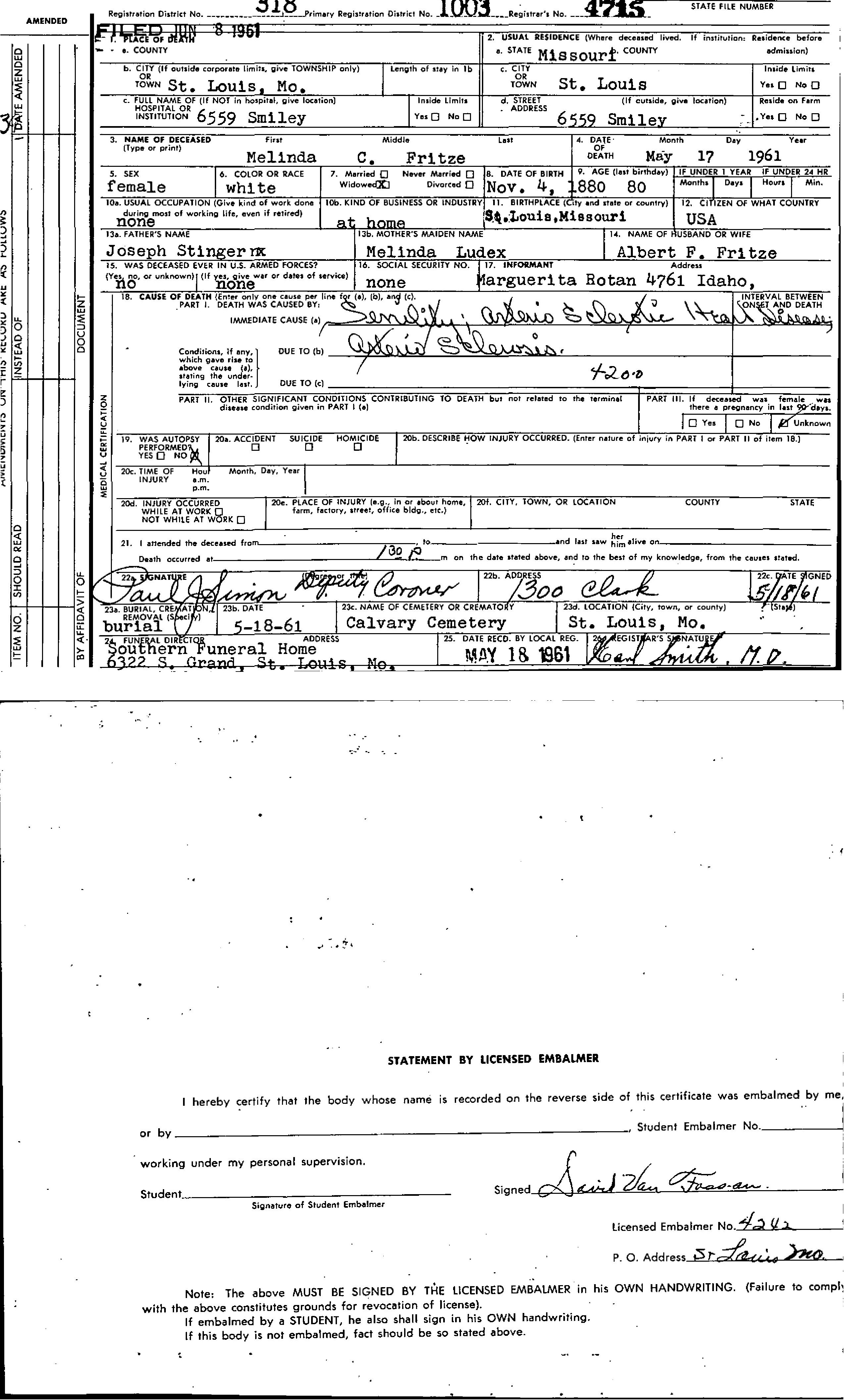 Ancestry.com Operations, Inc., Web: Missouri Death Certificates 1910-1962, St Louis City certificate 1961-018989, Melinda C Fritze; Database online, Ancestry.com LLC, Ancestry.com : 2015 (http://www.Ancestry.com/ : accessed 09/16/2019); citing Missouri Death Certificates, Missouri Secretary of State, Missouri Digital Heritage, Database and images [Surety: 3]. |