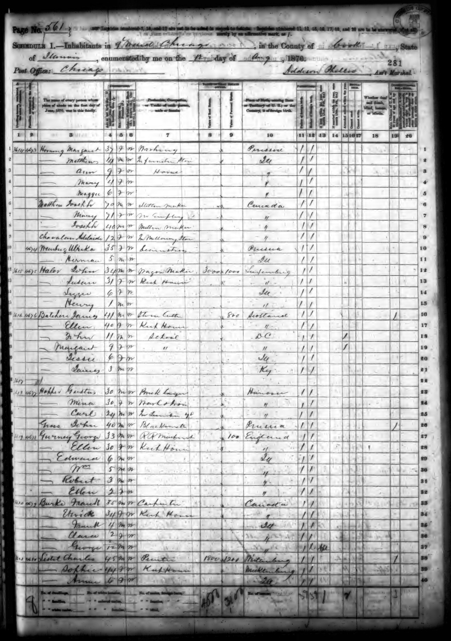 Ancestry.com Operations, Inc., 1870 United States Census, 9th Ward, Chicago, Cook, IL, page 561, dwelling 3619, family 4678, line 31, Guerney, Robert; Database and images, Ancestry.com LLC, Ancestry.com : 2009 (http://www.Ancestry.com/ : accessed 10/09/2025); citing Ninth Census of the United States, 1870 U. S. Census, population schedules, National Archives and Records Administration Microfilm Publication M593 (1761 rolls), Records of the Bureau of the Census, Record Group 29, National Archives, Washington, DC, roll 204, image 563 [Surety: 3]. |