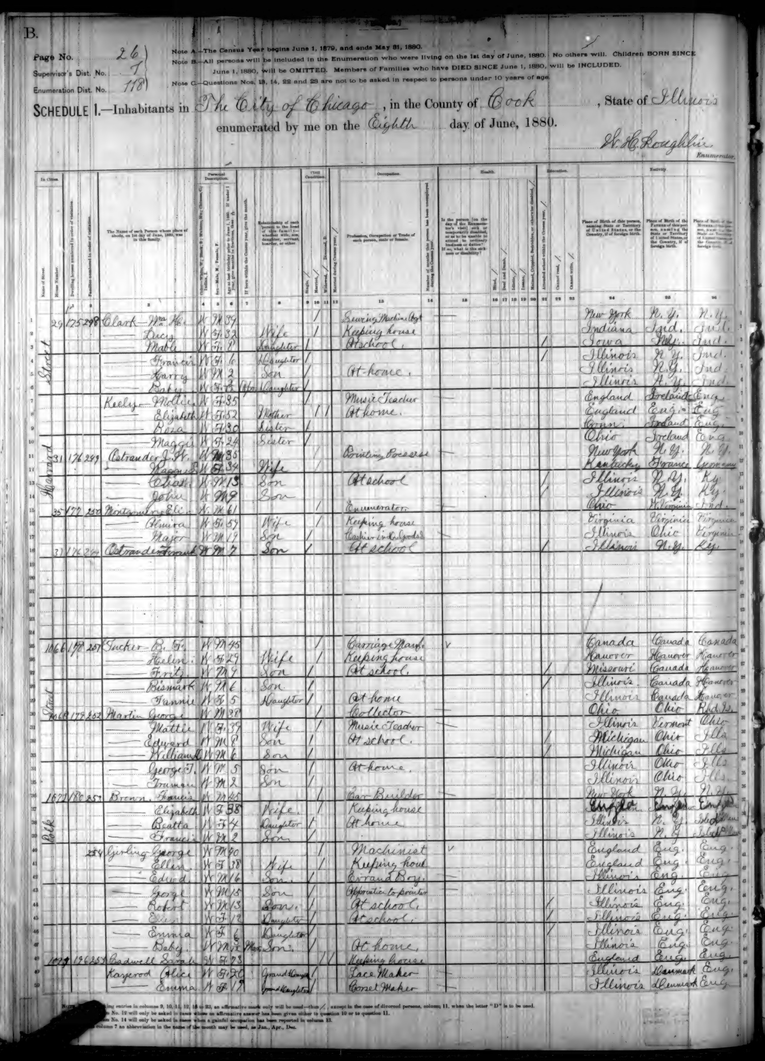 Ancestry.com Operations, Inc., 1880 United States Federal Census, ED 118, Chicago, Cook, IL, page 26, dwelling 180, family 254, line 44, Girling, Robert; Database and images, Ancestry.com LLC, Ancestry.com : 2010 (http://www.Ancestry.com/ : accessed 10/09/2025); citing Tenth Census of the United States, 1880 U. S. Census, population schedules, National Archives and Records Administration Microfilm Publication T9 (1454 rolls), Records of the Bureau of the Census, Record Group 29, National Archives, Washington, DC, roll 194, image 183 [Surety: 3]. |