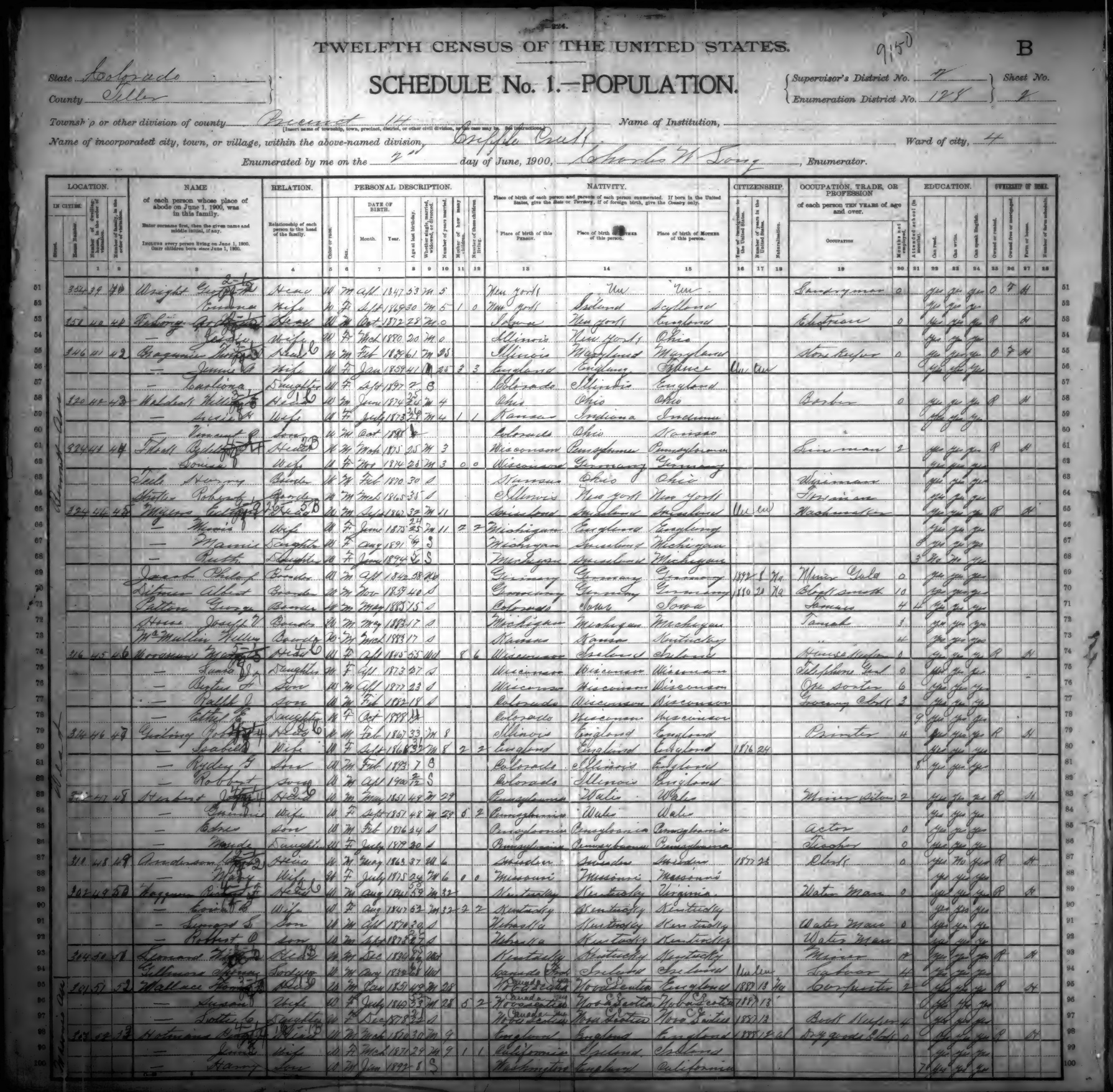 Ancestry.com Operations, Inc., 1900 United States Federal Census, ED 128, Cripple Creek, Teller, CO, sheet 2B, dwelling 46, family 47, line 29, Yerling, Robbert; Database and images, Ancestry.com LLC, Ancestry.com : 2010 (http://www.Ancestry.com/ : accessed 10/13/2025); citing Twelth Census of the United States, 1900 U. S. Census, population schedules, National Archives and Records Administration Microfilm Publication T623 (1854 rolls), Records of the Bureau of the Census, Record Group 29, National Archives, Washington, DC, roll 130, image 69 [Surety: 3]. |