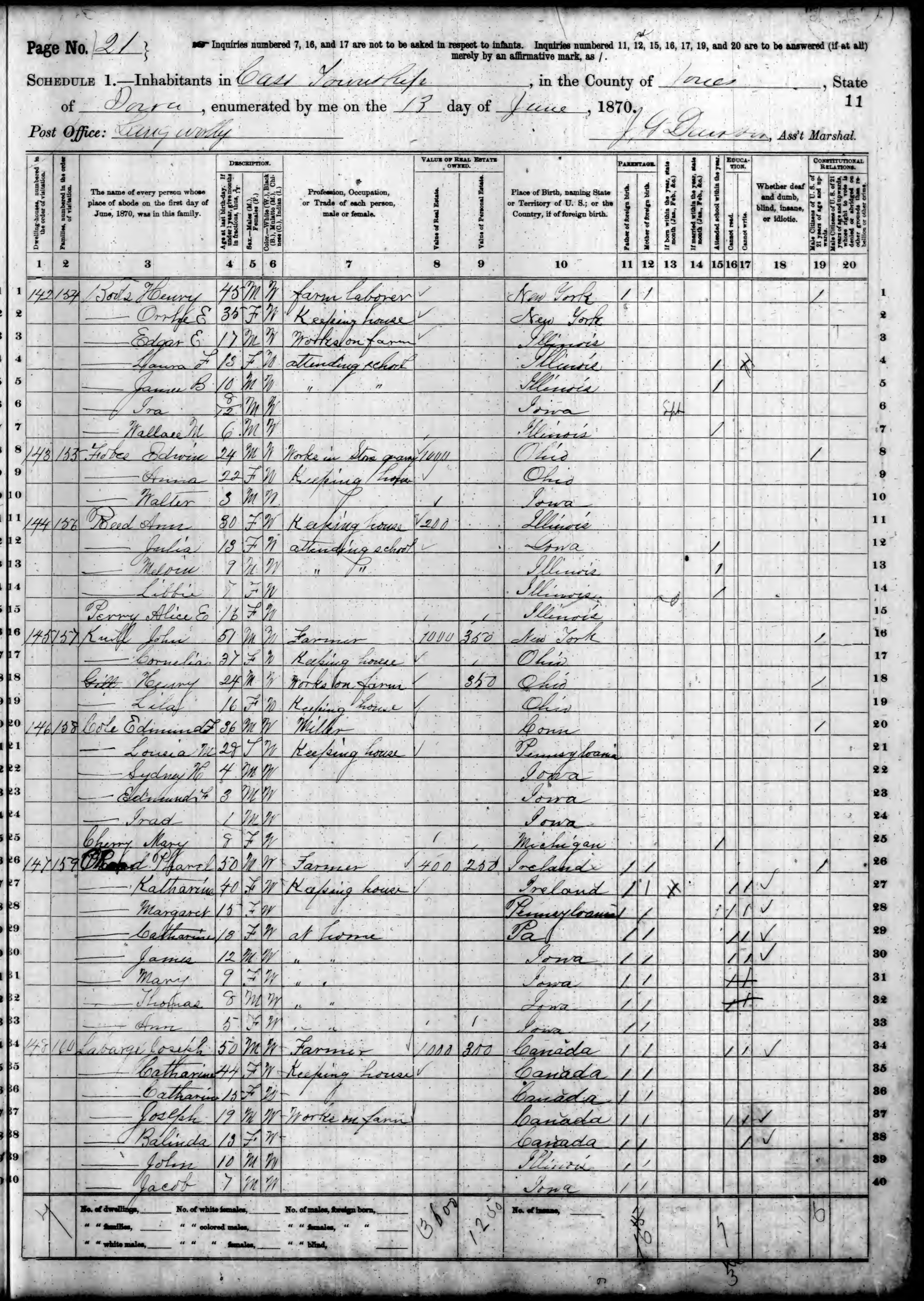 Ancestry.com Operations, Inc., 1870 United States Census, Cass, Jones, IA, page 21, dwelling 144, family 156, line 15, Perry, Alice E; Database and images, Ancestry.com LLC, Ancestry.com : 2009 (http://www.Ancestry.com/ : accessed 08/19/2021); citing Ninth Census of the United States, 1870 U. S. Census, population schedules, National Archives and Records Administration Microfilm Publication M593 (1761 rolls), Records of the Bureau of the Census, Record Group 29, National Archives, Washington, DC, roll 401, image 25 [Surety: 3]. |