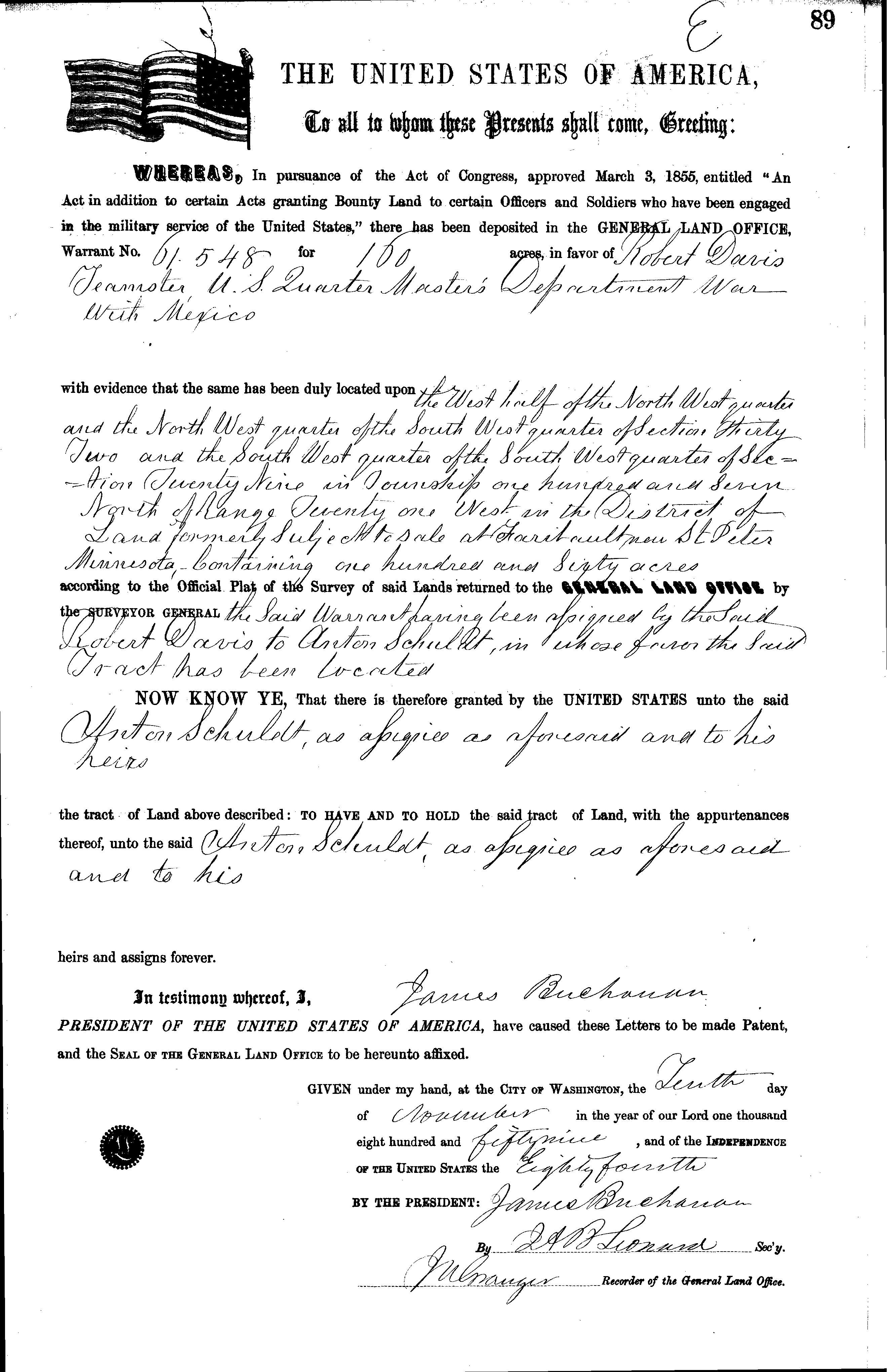 Ancestry.com Operations, Inc., U.S. General Land Office Records 1776-2015, Anton Schuldt, the W half of the NW quarter of Section 32 and the NW quarter of the SW quarter of Section 29 in Township 107N of Range 21W in a sale by Robert Davis; Database and images, Ancestry.com LLC, Ancestry.com : 2008 (http://www.Ancestry.com/ : accessed 07/15/2019); citing United States Bureau of Land Management, General Land Office Records, Automated Records Project, Federal Land Patents, State Volumes (http://www.glorecords.blm.gov/default.aspx), Springfield, Virginia, Eastern States, 2007, Accession Number MW-0308-089, Document Number 61548 [Surety: 3]. |
