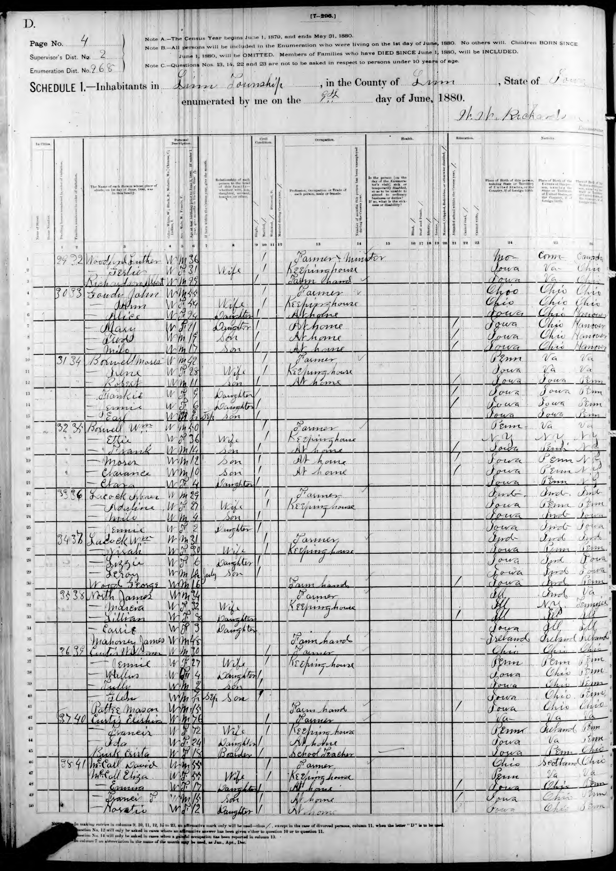 Ancestry.com Operations, Inc., 1880 United States Federal Census, ED 268, Linn, Linn, IA, page 4, dwelling 37, family 40, line 43, Curtis, Francis; Database and images, Ancestry.com LLC, Ancestry.com : 2010 (http://www.Ancestry.com/ : accessed 07/27/2021); citing Tenth Census of the United States, 1880 U. S. Census, population schedules, National Archives and Records Administration Microfilm Publication T9 (1454 rolls), Records of the Bureau of the Census, Record Group 29, National Archives, Washington, DC, roll 351, image 507 [Surety: 3]. |