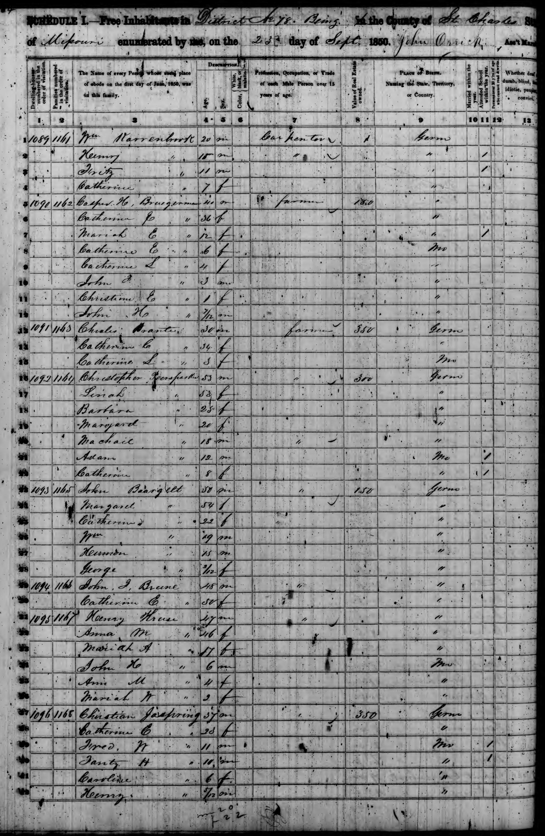 Ancestry.com Operations, Inc., 1850 United States Federal Census, District 78, St Charles, MO, page 118, dwelling 1091, family 1163, line 13, Charles Prante; Database and images, Ancestry.com LLC, Ancestry.com : 2009 (http://www.Ancestry.com/ : accessed 09/19/2019); citing Seventh Census of the United States, 1850 U. S. Census, population schedules, National Archives and Records Administration Microfilm Publication M432 (1009 rolls), Records of the Census Bureau, Record Group 29, National Archives, Washington, DC, roll 413, image 160 [Surety: 3]. |
