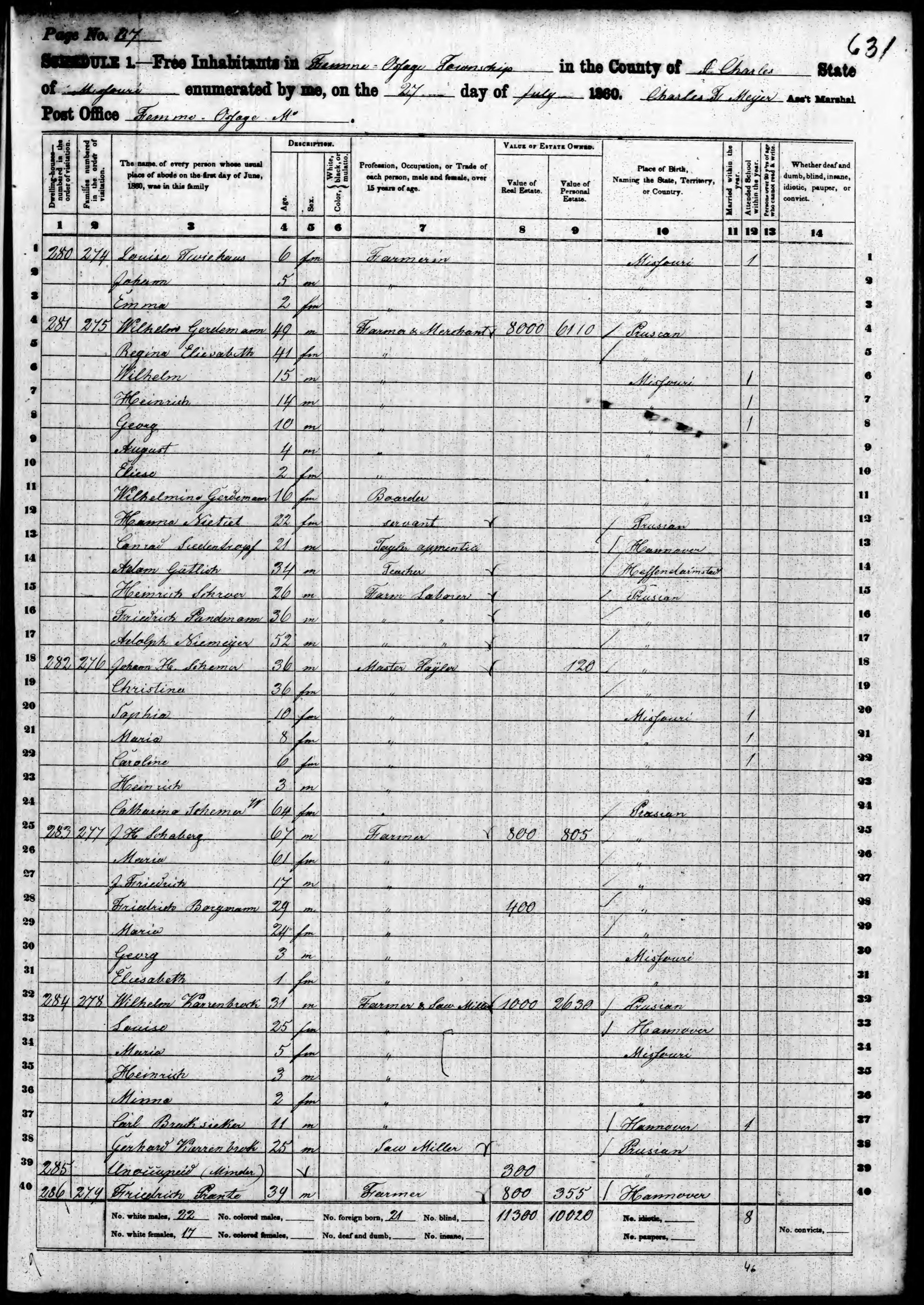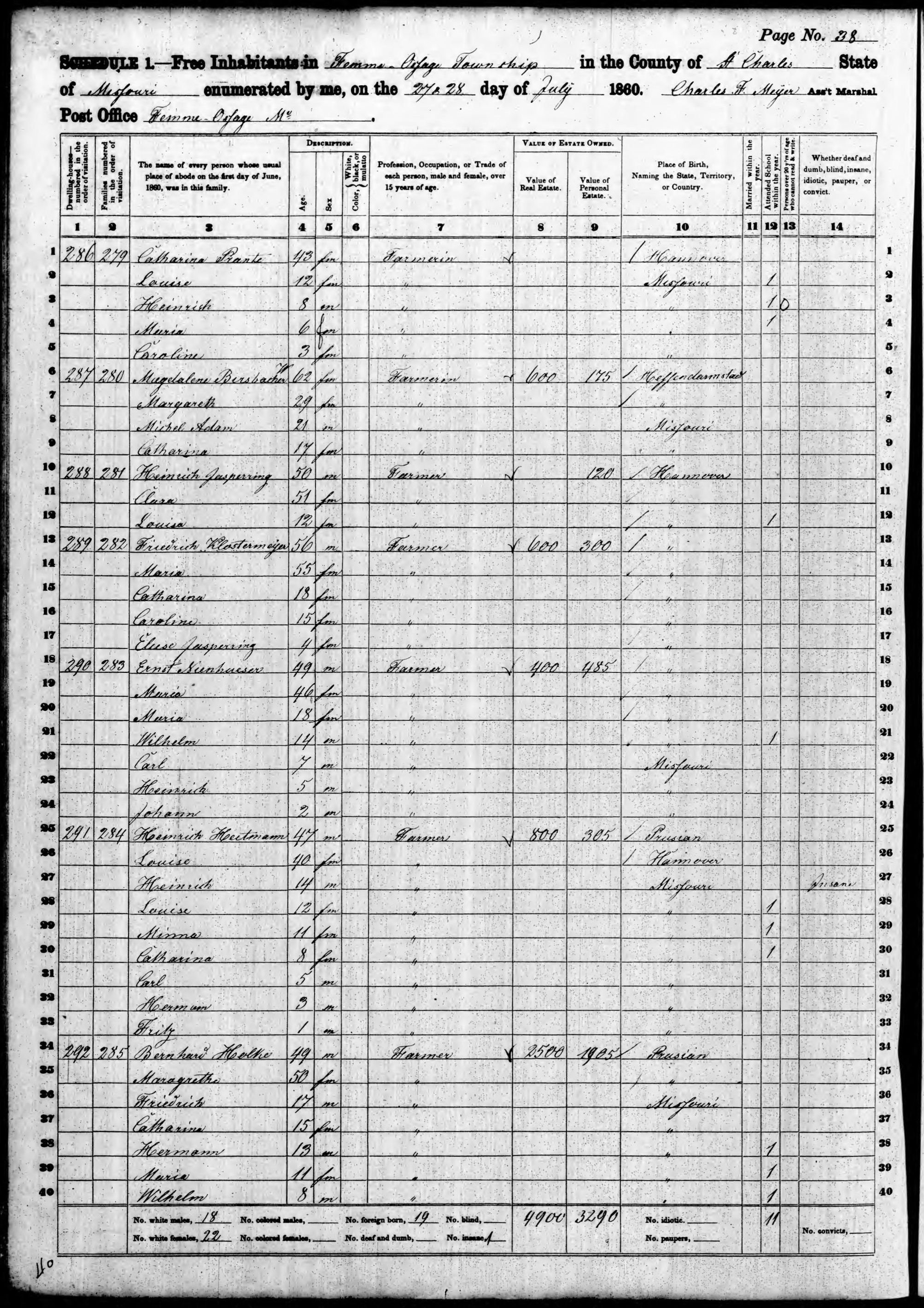 Ancestry.com Operations, Inc., 1860 United States Federal Census, Femme Osage, St Charles, MO, page 37, dwelling 286, family 279, line 40, Friedrich Prante; Database and images, Ancestry.com LLC, Ancestry.com : 2009 (http://www.Ancestry.com/ : accessed 09/19/2019); citing Eighth Census of the United States, 1860 U. S. Census, population schedules, National Archives and Records Administration Microfilm Publication M653 (1438 rolls), Records of the Census Bureau, Record Group 29, National Archives, Washington, DC, roll 644, image 136 [Surety: 3]. |
