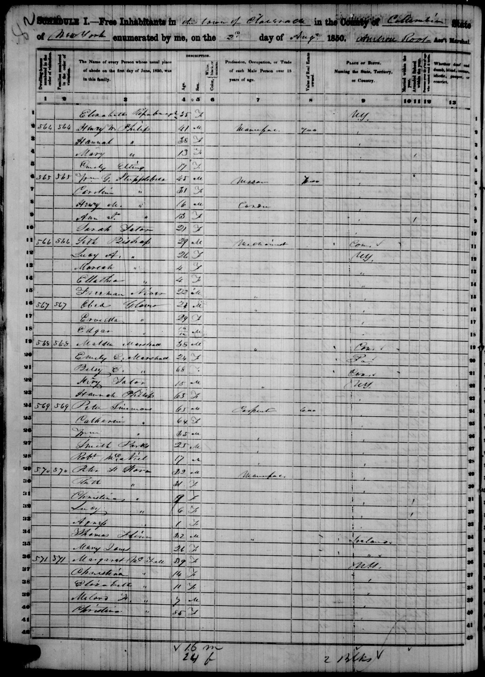 Ancestry.com Operations, Inc., 1850 United States Federal Census, Claverack, Columbia, NY, page 41B, dwelling 568, family 568, line 19, Malden Marshall; Database and images, Ancestry.com LLC, Ancestry.com : 2009 (http://www.Ancestry.com/ : accessed 12/09/2021); citing Seventh Census of the United States, 1850 U. S. Census, population schedules, National Archives and Records Administration Microfilm Publication M432 (1009 rolls), Records of the Census Bureau, Record Group 29, National Archives, Washington, DC, roll 491, image 90 [Surety: 3]. |