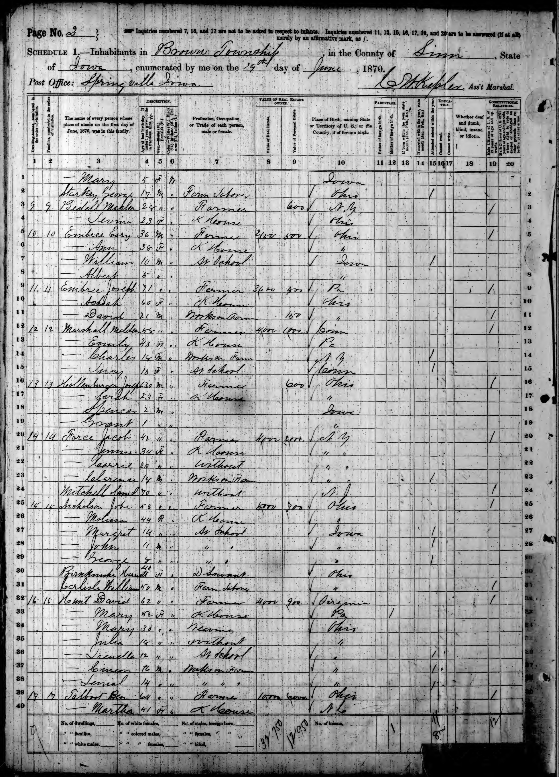 Ancestry.com Operations, Inc., 1870 United States Census, Brown, Linn, IA, page 2, dwelling 12, family 12, line 12, Marshall, Malden; Database and images, Ancestry.com LLC, Ancestry.com : 2009 (http://www.Ancestry.com/ : accessed 12/10/2021); citing Ninth Census of the United States, 1870 U. S. Census, population schedules, National Archives and Records Administration Microfilm Publication M593 (1761 rolls), Records of the Bureau of the Census, Record Group 29, National Archives, Washington, DC, roll 405, image 57 [Surety: 3]. |