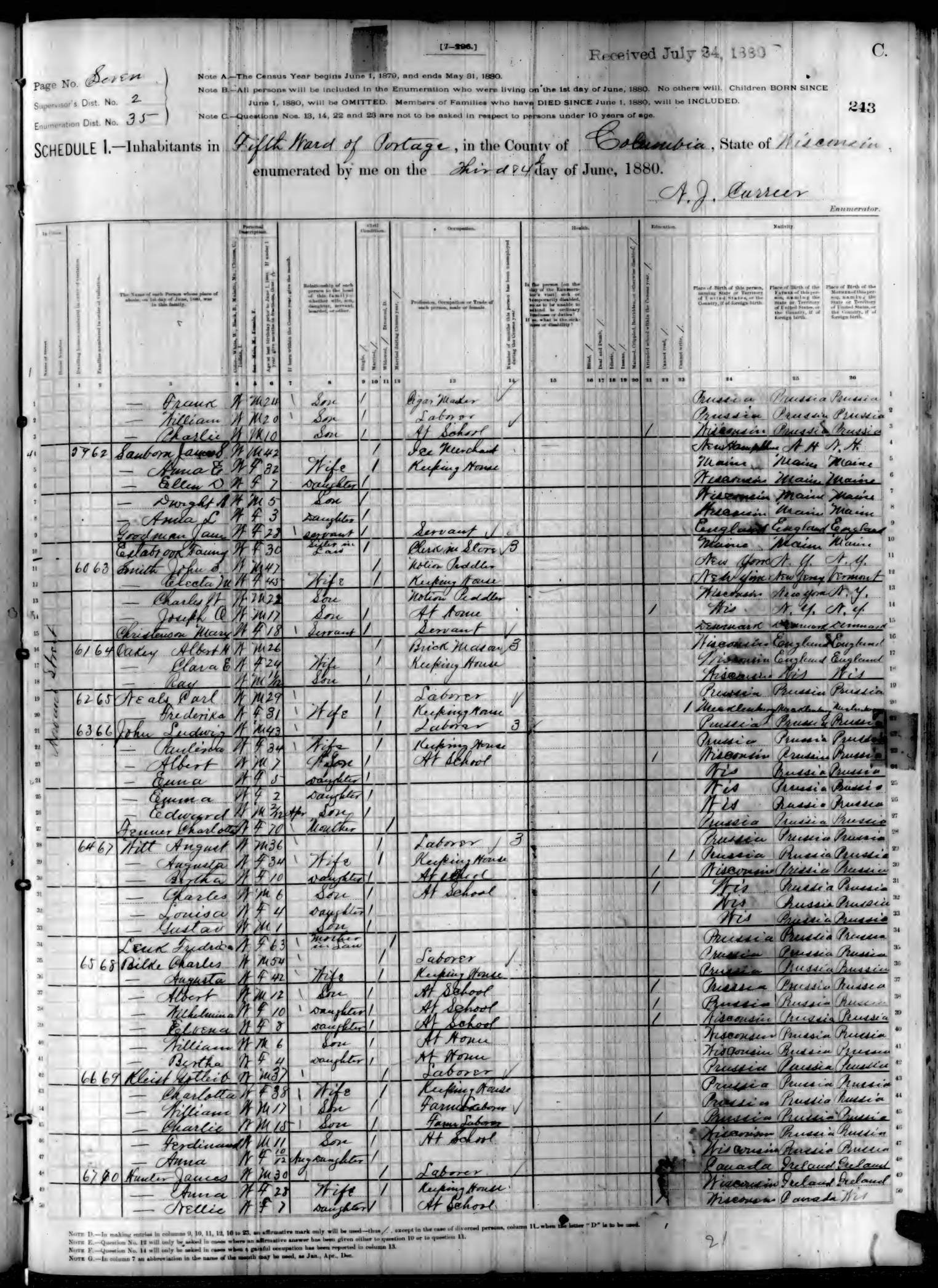 Ancestry.com Operations, Inc., 1880 United States Federal Census, ED 35, Portage, Columbia, WI, page 6, dwelling 51, family 54, line 16, Grotzke, Albert; Database and images, Ancestry.com LLC, Ancestry.com : 2010 (http://www.Ancestry.com/ : accessed 10/06/2022); citing Tenth Census of the United States, 1880 U. S. Census, population schedules, National Archives and Records Administration Microfilm Publication T9 (1454 rolls), Records of the Bureau of the Census, Record Group 29, National Archives, Washington, DC, roll 1420, image 489 [Surety: 3]. |