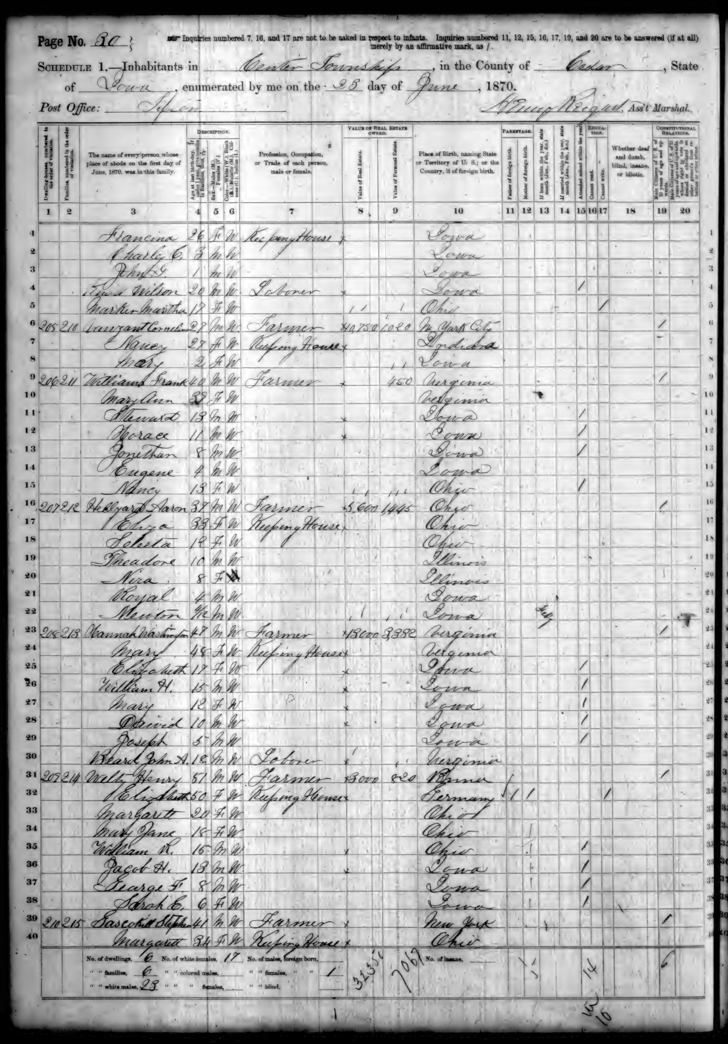 Ancestry.com Operations, Inc., 1870 United States Census, Center, Tipton, IA, page 30, dwelling 209, family 214, line 38, Welty, Sarah E; Database and images, Ancestry.com LLC, Ancestry.com : 2009 (http://www.Ancestry.com/ : accessed 08/11/2025); citing Ninth Census of the United States, 1870 U. S. Census, population schedules, National Archives and Records Administration Microfilm Publication M593 (1761 rolls), Records of the Bureau of the Census, Record Group 29, National Archives, Washington, DC, roll 380, image 305 [Surety: 3]. |