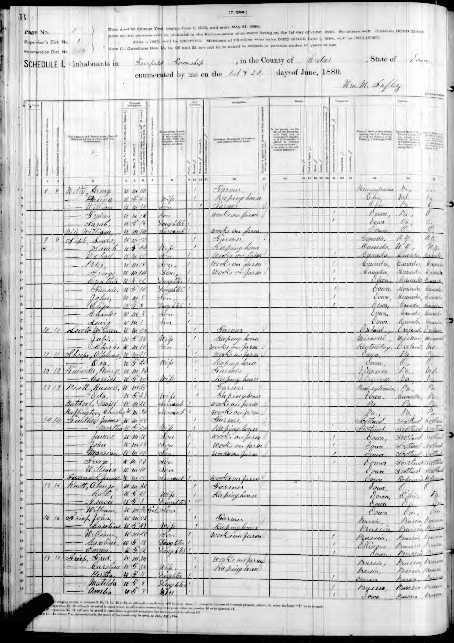 Ancestry.com Operations, Inc., 1880 United States Federal Census, ED 347, Fairfield, Cedar, IA, page 2, dwelling 8, family 8, line 5, Welty, Sarah; Database and images, Ancestry.com LLC, Ancestry.com : 2010 (http://www.Ancestry.com/ : accessed 08/11/2025); citing Tenth Census of the United States, 1880 U. S. Census, population schedules, National Archives and Records Administration Microfilm Publication T9 (1454 rolls), Records of the Bureau of the Census, Record Group 29, National Archives, Washington, DC, roll 331, image 336 [Surety: 3]. |