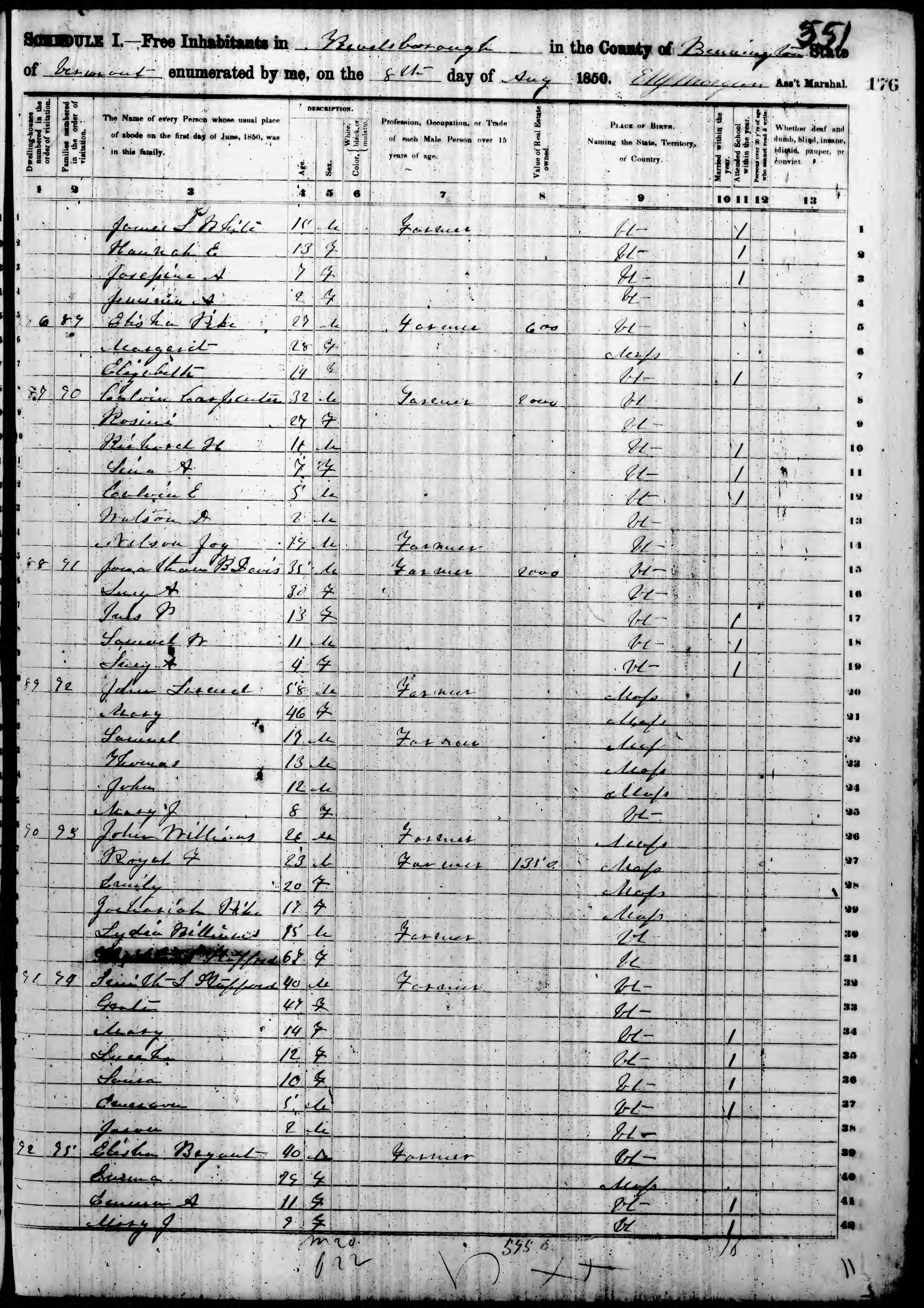Ancestry.com Operations, Inc., 1850 United States Federal Census, Readsborough, Bennington, VT, page 11, dwelling 86, family 89, line 5, Elisha Pike; Database and images, Ancestry.com LLC, Ancestry.com : 2009 (http://www.Ancestry.com/ : accessed 04/22/2022); citing Seventh Census of the United States, 1850 U. S. Census, population schedules, National Archives and Records Administration Microfilm Publication M432 (1009 rolls), Records of the Census Bureau, Record Group 29, National Archives, Washington, DC, roll 921, image 346 [Surety: 3]. |