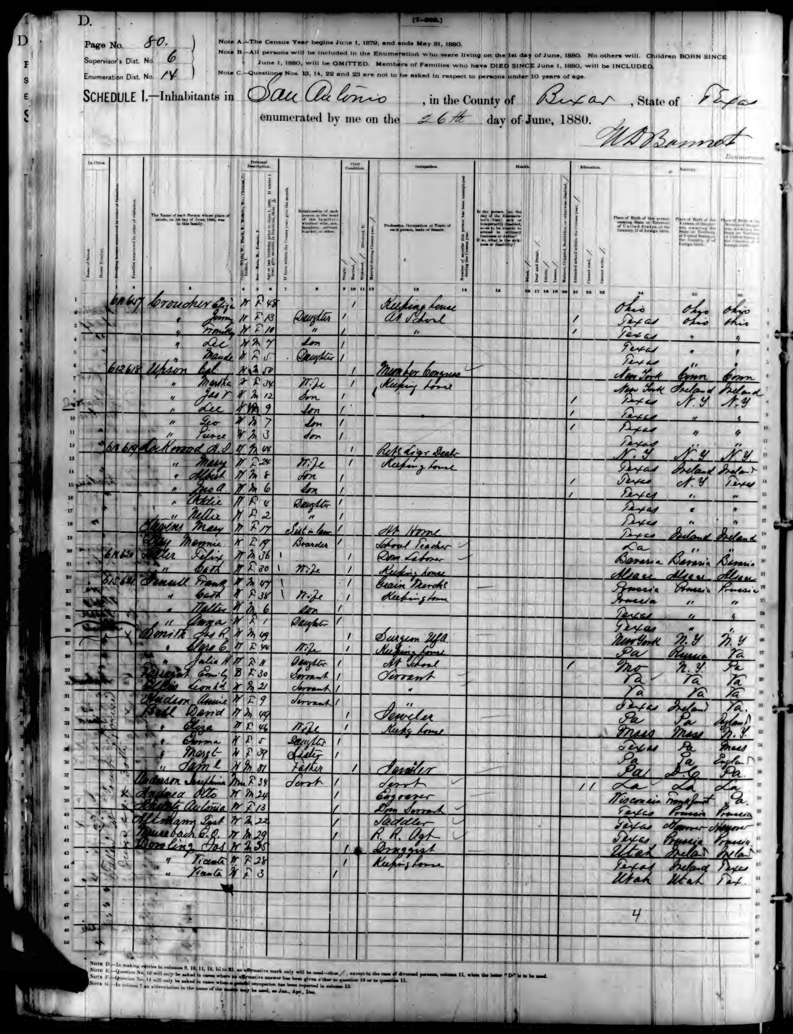 Ancestry.com Operations, Inc., 1880 United States Federal Census, ED 14, San Antonio, page 80, dwelling 615, family 621, line 25, Jenull, Anna; Database and images, Ancestry.com LLC, Ancestry.com : 2010 (http://www.Ancestry.com/ : accessed 01/03/2025); citing Tenth Census of the United States, 1880 U. S. Census, population schedules, National Archives and Records Administration Microfilm Publication T9 (1454 rolls), Records of the Bureau of the Census, Record Group 29, National Archives, Washington, DC, roll 1291, image 319 [Surety: 3]. |
