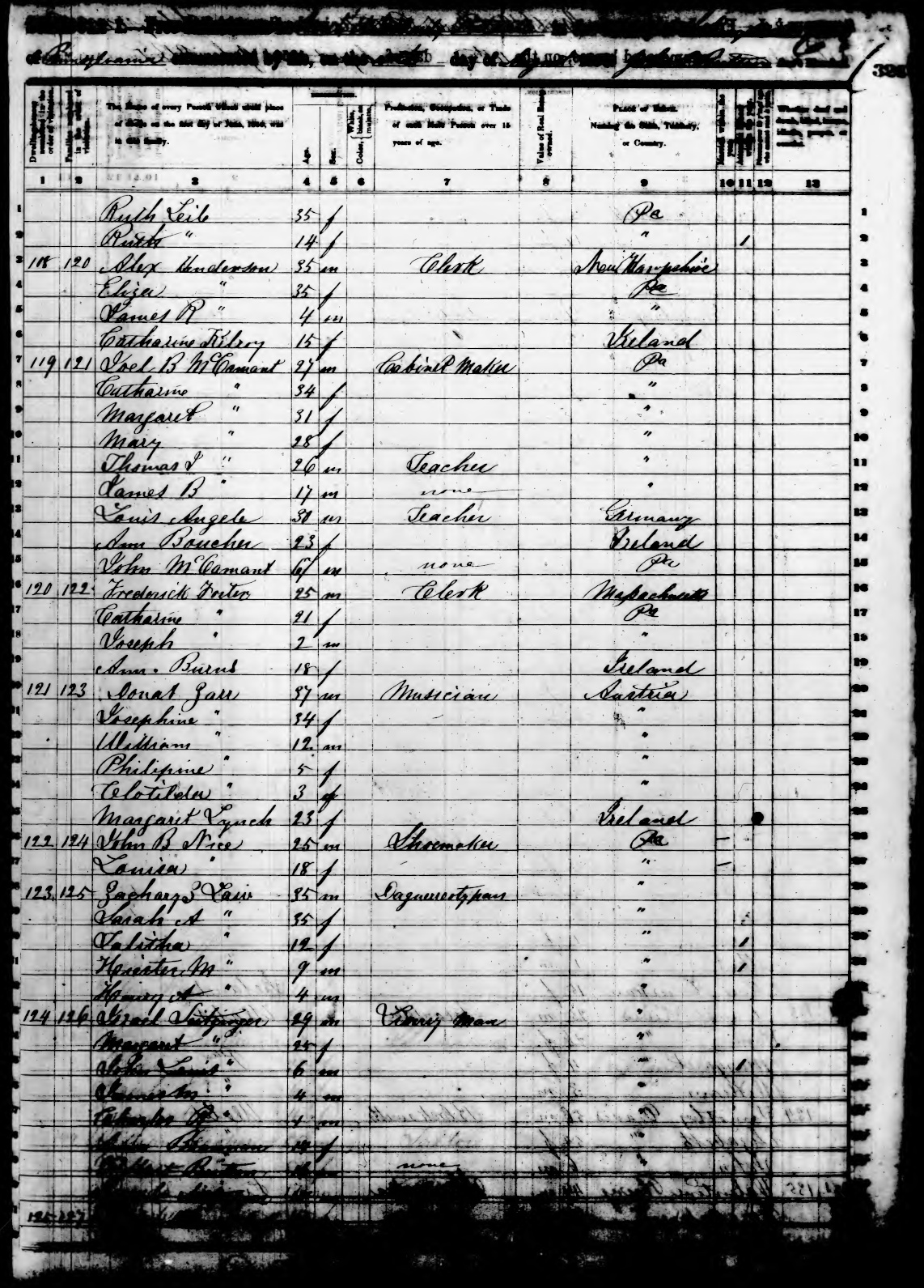 Ancestry.com Operations, Inc., 1850 United States Federal Census, Pottsville, Schuylkill, PA, page 17, dwelling 124, family 126, line 33, Israel Seitzinger; Database and images, Ancestry.com LLC, Ancestry.com : 2009 (http://www.Ancestry.com/ : accessed 06/05/2025); citing Seventh Census of the United States, 1850 U. S. Census, population schedules, National Archives and Records Administration Microfilm Publication M432 (1009 rolls), Records of the Census Bureau, Record Group 29, National Archives, Washington, DC, roll 827, image 583 [Surety: 3]. |