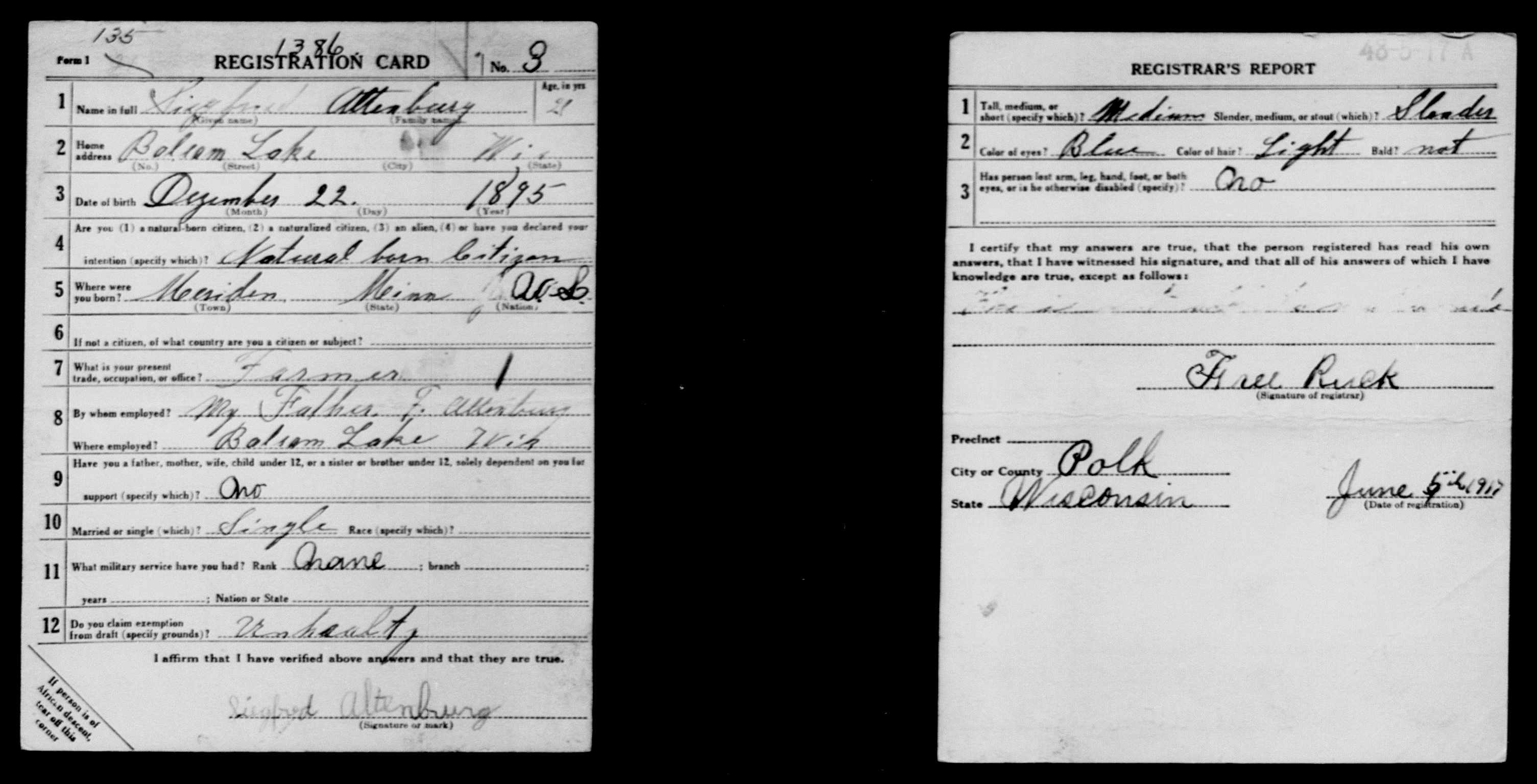 He registered for the Draft for World War I on 06/05/1917 in Polk County, Wisconsin . [5] |