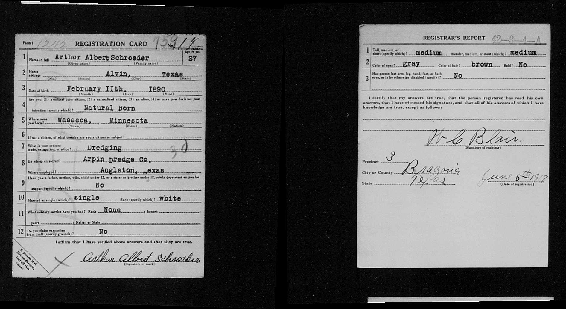 He was described as of medium height and build with brown hair and grey eyes on 06/06/1917 in Alvin, Brazoria, Texas . [5] |