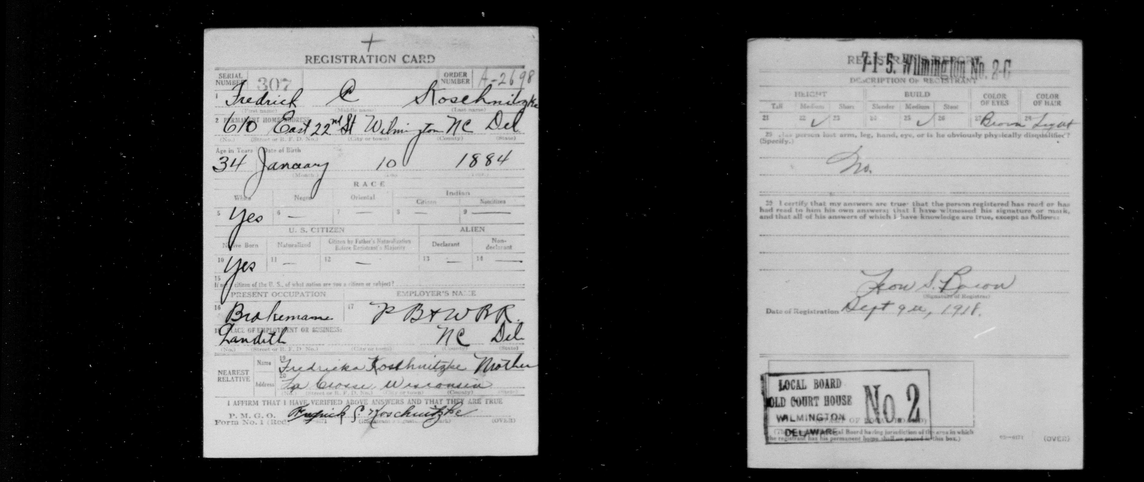 He registered for the Draft for World War I on 09/09/1918 in Wilmington, New Castle, Delaware . [2] |