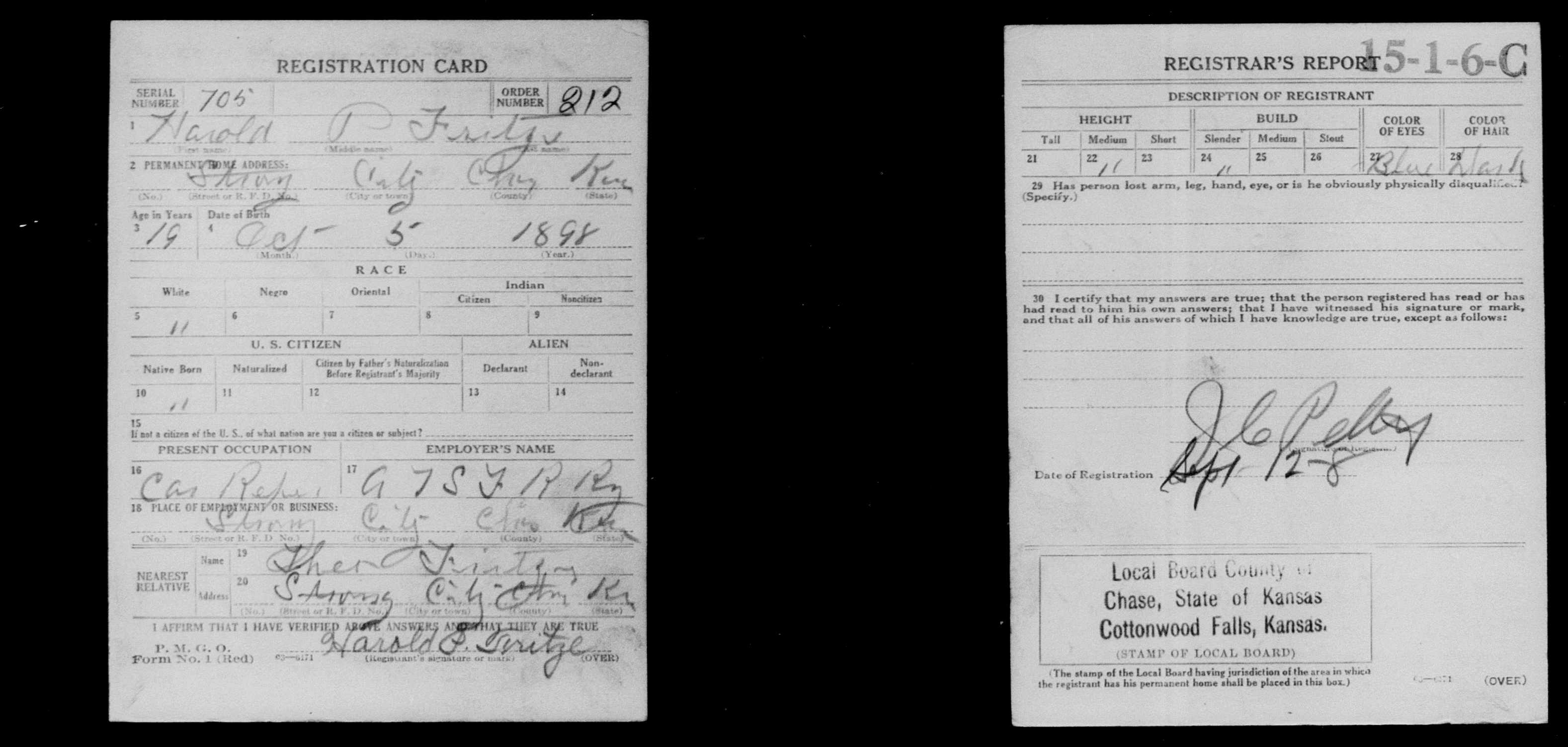 He registered for the Draft for World War I on 09/12/1918 in Cottonwood Falls, Chase, Kansas . [5] |