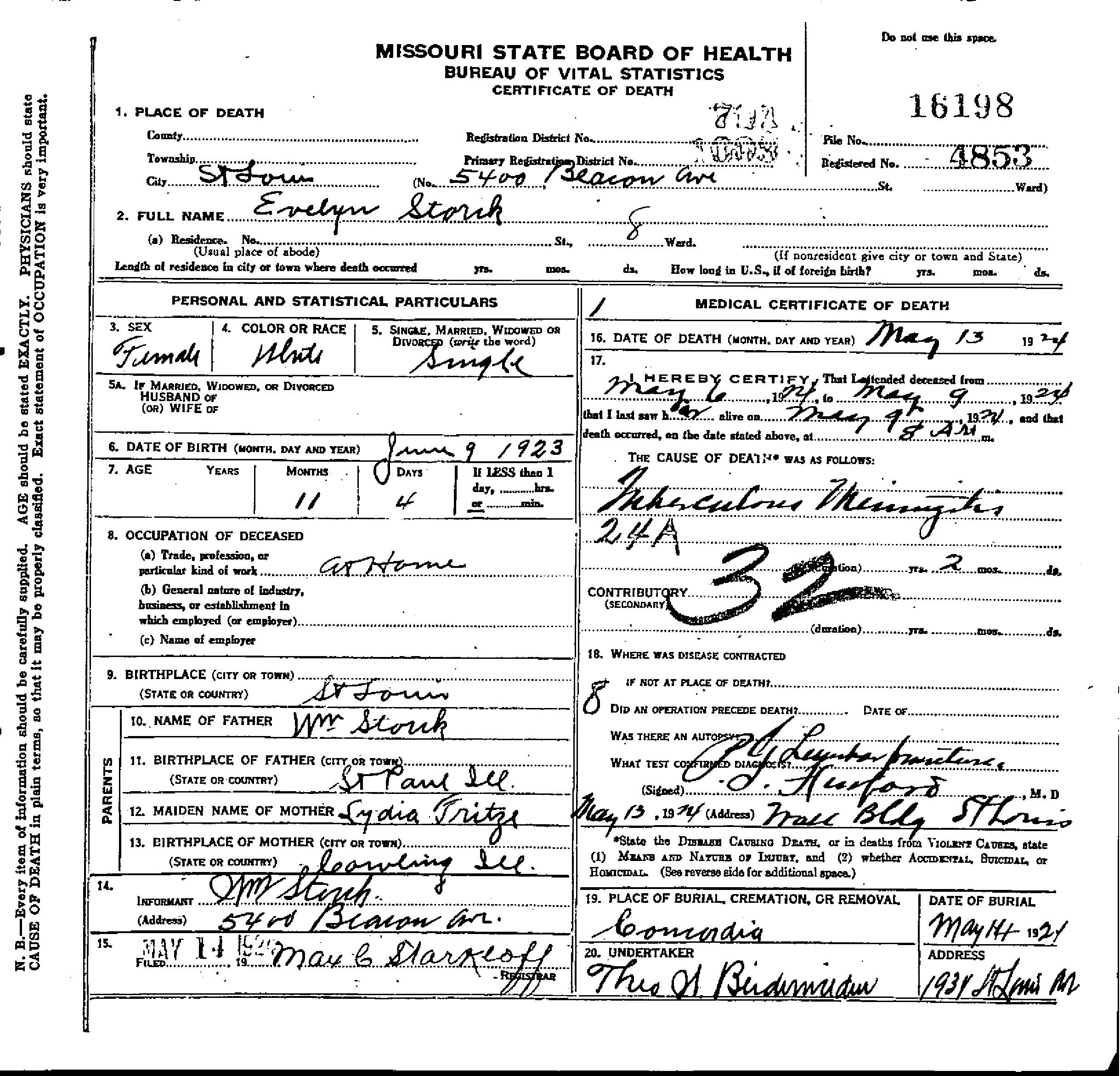 1. | She died from tuberculosis meningitis on 05/13/1924 in St Louis City, , Missouri . [1] |