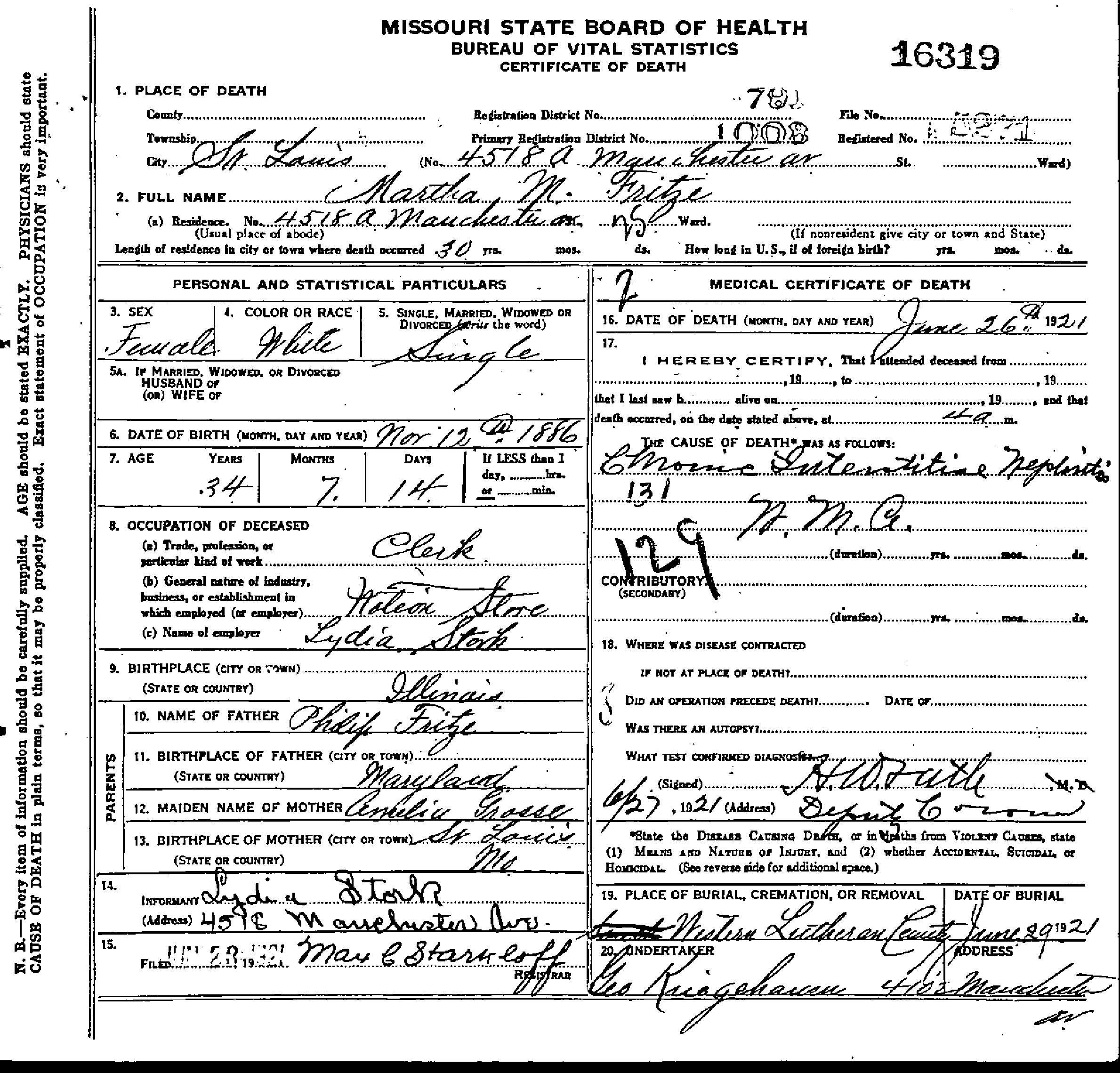 Ancestry.com Operations, Inc., Web: Missouri Death Certificates 1910-1962, St Louis City certificate 1921-016319, Martha M Fritze; Database online, Ancestry.com LLC, Ancestry.com : 2015 (http://www.Ancestry.com/ : accessed 05/03/2012); citing Missouri Death Certificates, Missouri Secretary of State, Missouri Digital Heritage, Database and images [Surety: 3]. |