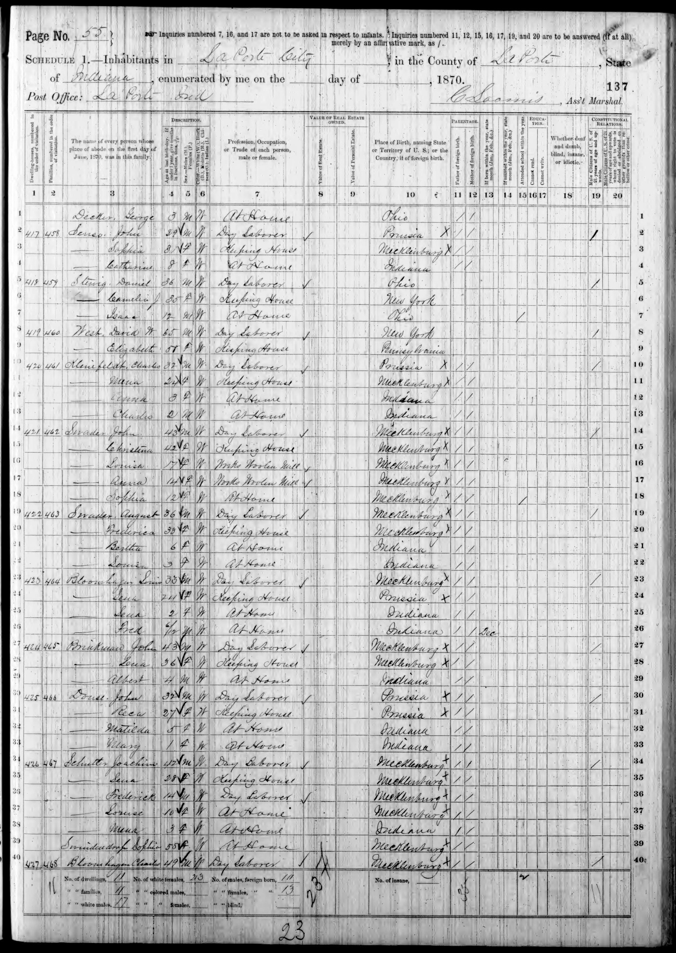 Ancestry.com Operations, Inc., 1870 United States Census, LaPorte, LaPorte, IN, page 55, dwelling 416, family 457, line 41, Decker, George; Database and images, Ancestry.com LLC, Ancestry.com : 2009 (http://www.Ancestry.com/ : accessed 04/23/2012); citing Ninth Census of the United States, 1870 U. S. Census, population schedules, National Archives and Records Administration Microfilm Publication M593 (1761 rolls), Records of the Bureau of the Census, Record Group 29, National Archives, Washington, DC, roll 334, image 280 [Surety: 3]. |