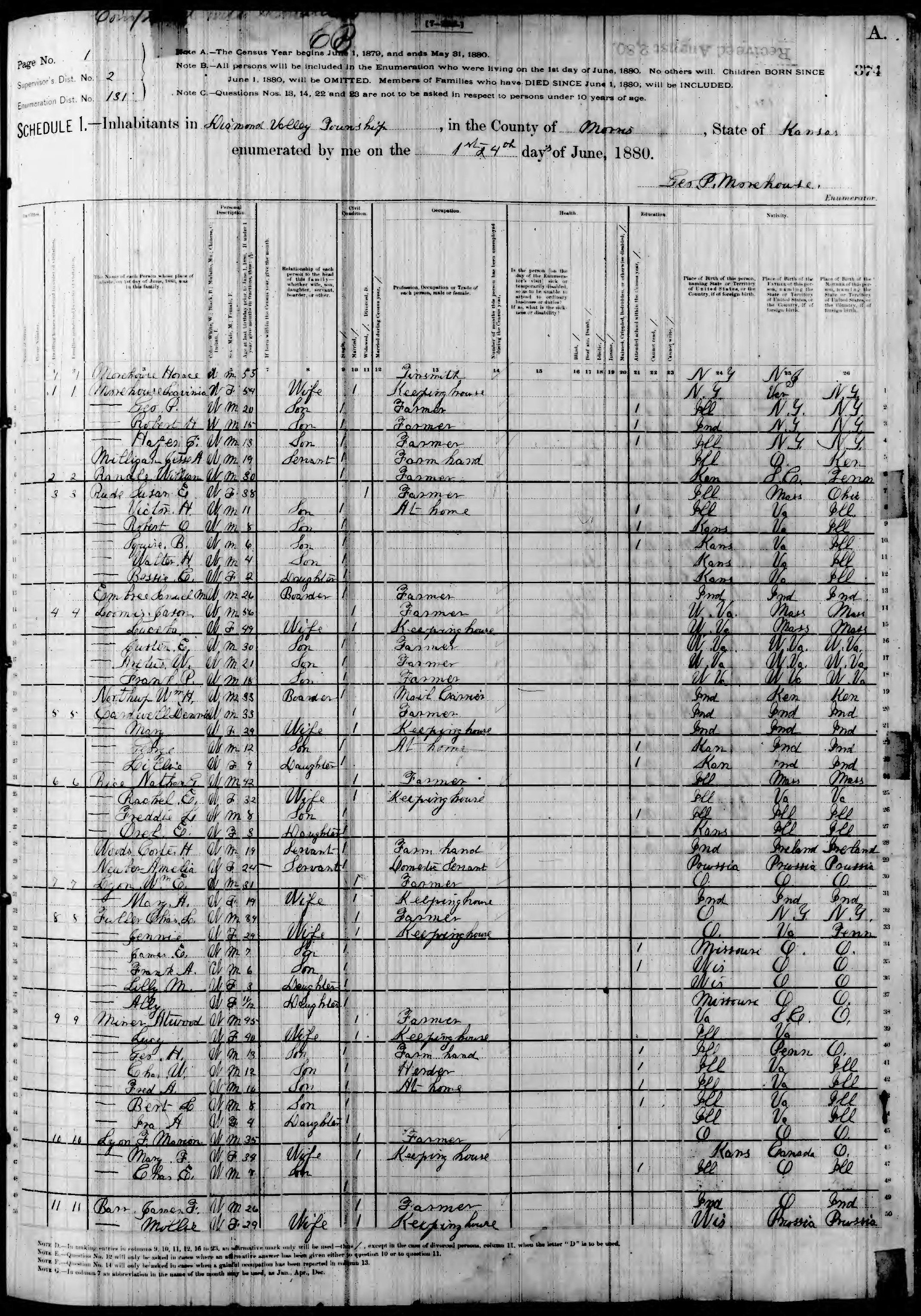 | 6. | Ancestry.com Operations, Inc., 1880 United States Federal Census, ED 131, Diamond Valley, Morris, KS, page 1A, dwelling 11, family 11, line 50, Barr, Mollie; Database and images, Ancestry.com LLC, Ancestry.com : 2010 (http://www.Ancestry.com/ : accessed 02/04/2016); citing Tenth Census of the United States, 1880 U. S. Census, population schedules, National Archives and Records Administration Microfilm Publication T9 (1454 rolls), Records of the Bureau of the Census, Record Group 29, National Archives, Washington, DC, roll 390, image 249 [Surety: 3]. |
