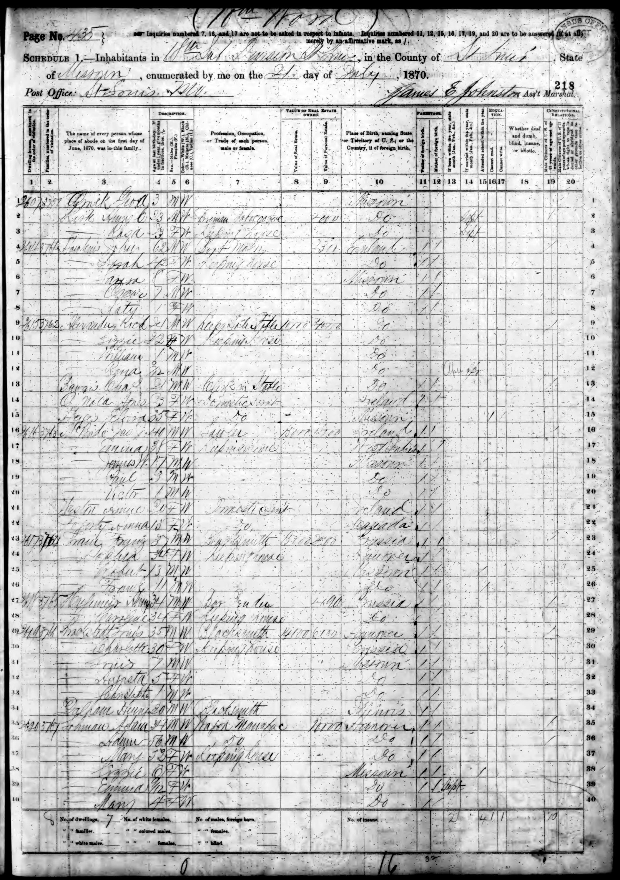 Ancestry.com Operations, Inc., 1870 United States Census, Ward 10, SaintLouis City, MO, page 435, dwelling 2620, family 3767, line 38, Lohman, Lizzie; Database and images, Ancestry.com LLC, Ancestry.com : 2009 (http://www.Ancestry.com/ : accessed 12/09/2013); citing Ninth Census of the United States, 1870 U. S. Census, population schedules, National Archives and Records Administration Microfilm Publication M593 (1761 rolls), Records of the Bureau of the Census, Record Group 29, National Archives, Washington, DC, roll 820, image 440 [Surety: 3]. |
