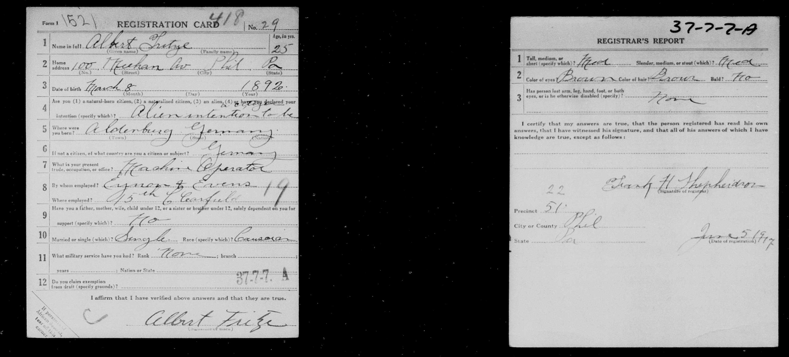 Ancestry.com Operations, Inc., U.S. World War I Draft Registration Cards, 1917-1918, Albert Fritze; Database and images, Ancestry.com LLC, Ancestry.com : 2005 (http://www.Ancestry.com/ : accessed 02/25/2016); citing National Archives and Records Administration, United States Selective Service System, "World War I Selective Service System Draft Registration Cards, 1917-1918," Washington, DC, Series M1509, 4,582 rolls [Surety: 3]. |