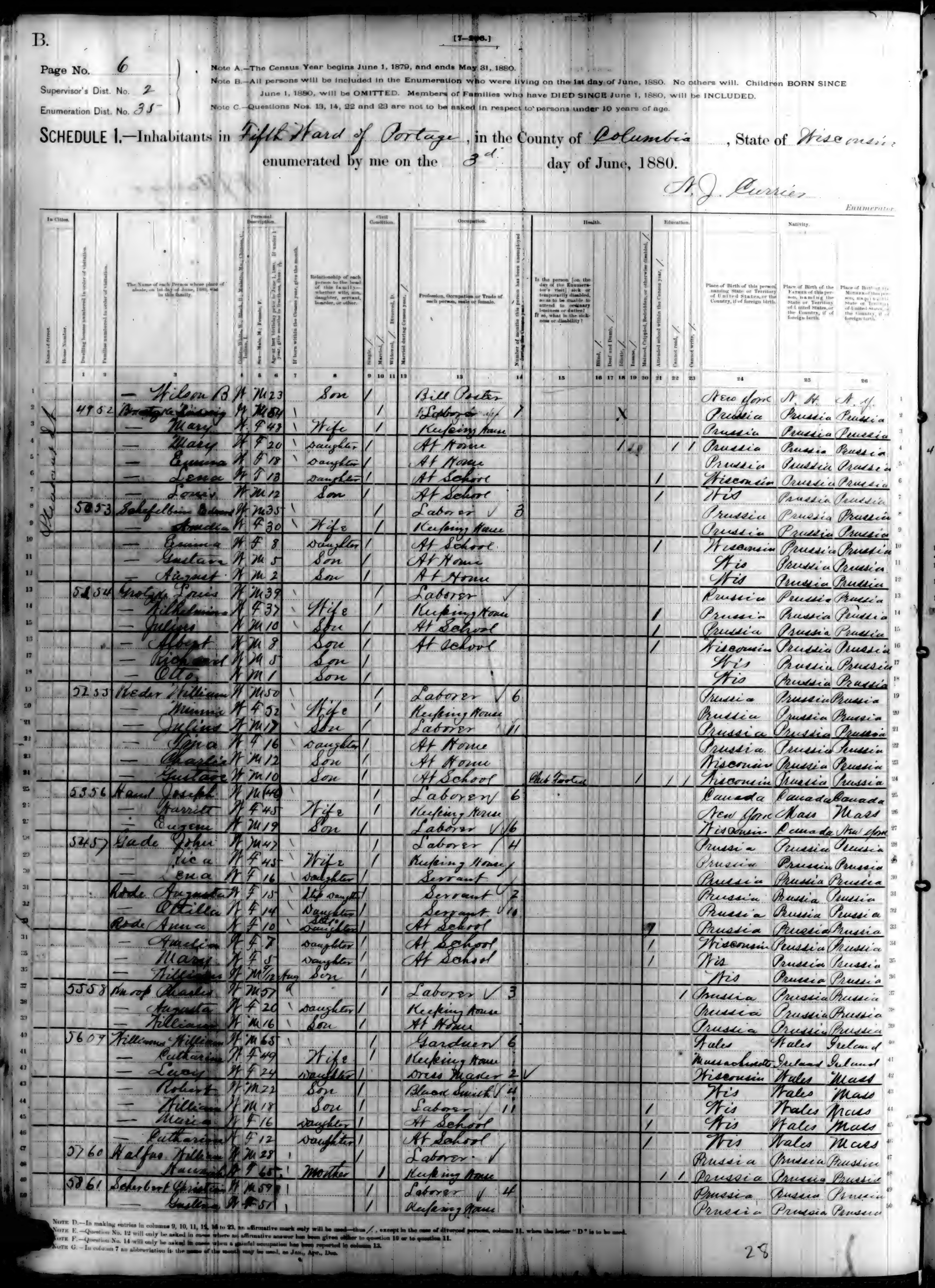 Ancestry.com Operations, Inc., 1880 United States Federal Census, ED 35, Portage, Columbia, WI, page 6, dwelling 51, family 54, line 15, Grotzke, Julius; Database and images, Ancestry.com LLC, Ancestry.com : 2010 (http://www.Ancestry.com/ : accessed 10/06/2022); citing Tenth Census of the United States, 1880 U. S. Census, population schedules, National Archives and Records Administration Microfilm Publication T9 (1454 rolls), Records of the Bureau of the Census, Record Group 29, National Archives, Washington, DC, roll 1420, image 489 [Surety: 3]. |