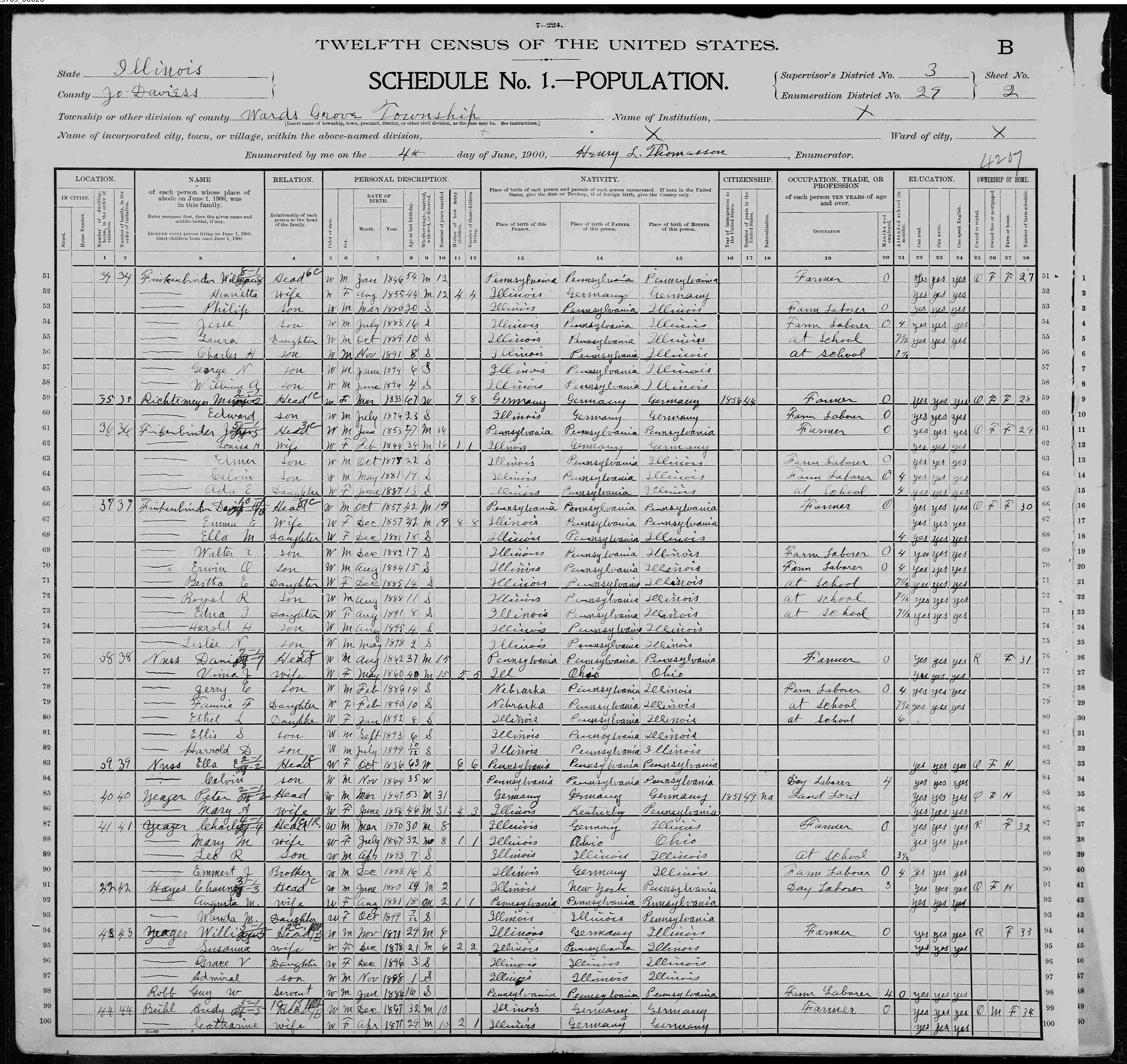 Ancestry.com Operations, Inc., 1900 United States Federal Census, ED 29, Wards Grove, Jo Daviess, IL, sheet 2B, dwelling 34, family 34, line 57, Finkenbinder, George N; Database and images, Ancestry.com LLC, Ancestry.com : 2010 (http://www.Ancestry.com/ : accessed 05/16/2018); citing Twelth Census of the United States, 1900 U. S. Census, population schedules, National Archives and Records Administration Microfilm Publication T623 (1854 rolls), Records of the Bureau of the Census, Record Group 29, National Archives, Washington, DC, roll 310, image 27 [Surety: 3]. |