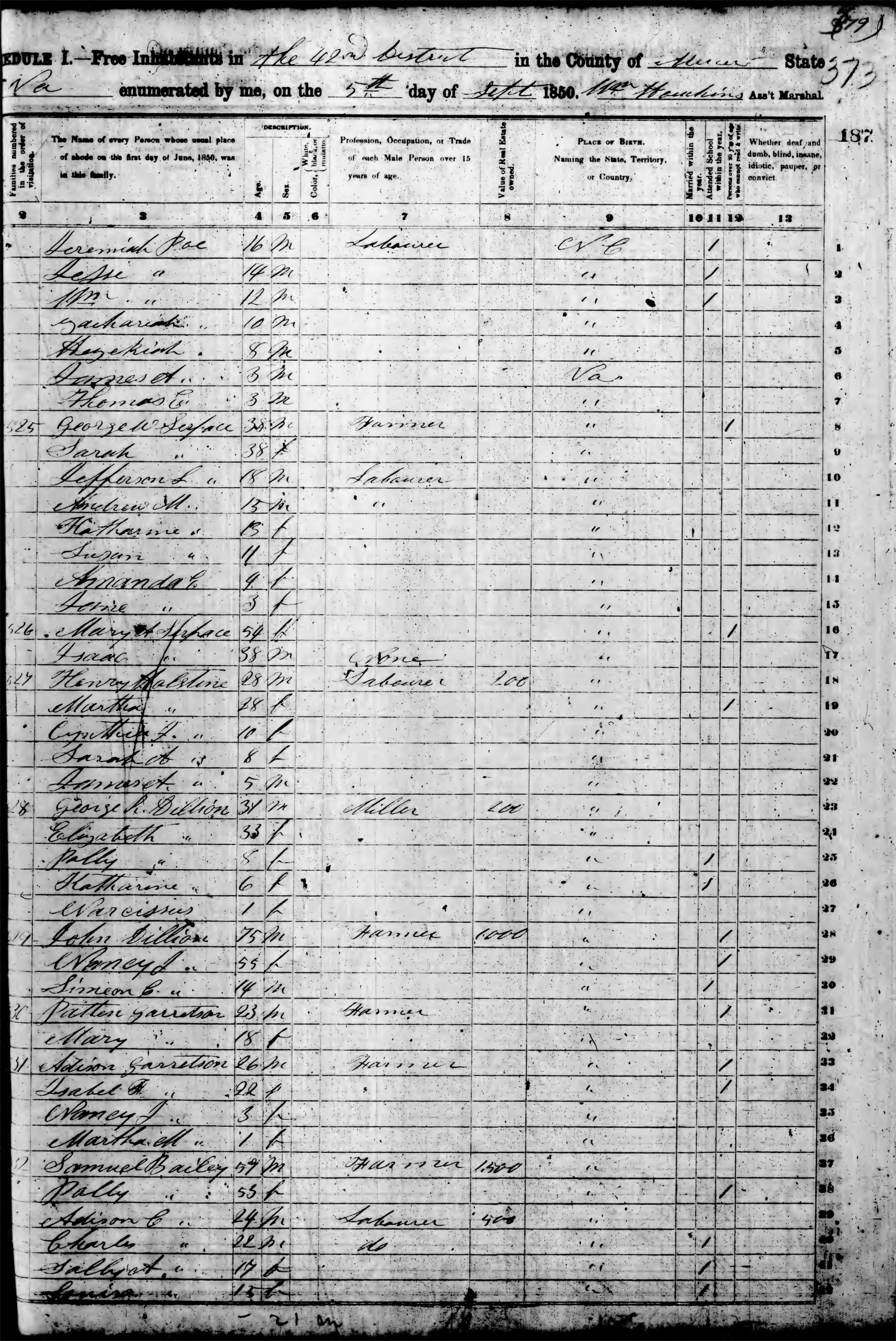 Ancestry.com Operations, Inc., 1850 United States Federal Census, District 42, Mercer, VA, page 79, family 524, line 4, Zachariah Poe; Database and images, Ancestry.com LLC, Ancestry.com : 2009 (http://www.Ancestry.com/ : accessed 07/16/2019); citing Seventh Census of the United States, 1850 U. S. Census, population schedules, National Archives and Records Administration Microfilm Publication M432 (1009 rolls), Records of the Census Bureau, Record Group 29, National Archives, Washington, DC, roll 960, image 372 [Surety: 3]. |