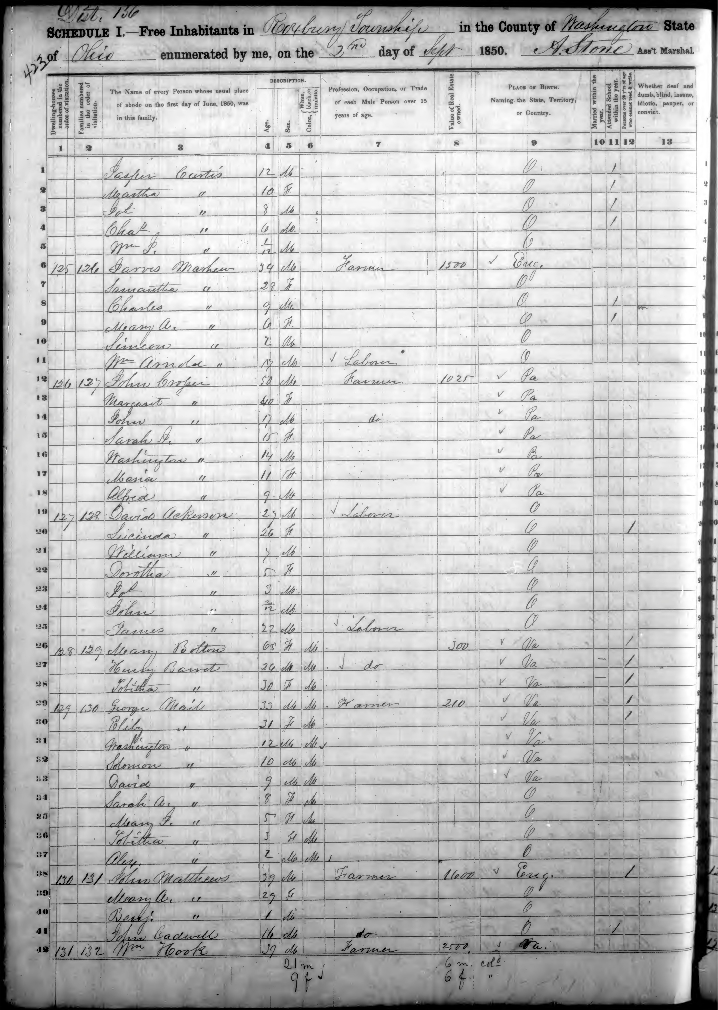 Ancestry.com Operations, Inc., 1850 United States Federal Census, Roxbury, Washington, OH, page 18, dwelling 124, family 125, line 2, Martha Curtis; Database and images, Ancestry.com LLC, Ancestry.com : 2009 (http://www.Ancestry.com/ : accessed 08/07/2019); citing Seventh Census of the United States, 1850 U. S. Census, population schedules, National Archives and Records Administration Microfilm Publication M432 (1009 rolls), Records of the Census Bureau, Record Group 29, National Archives, Washington, DC, roll 738, image 493 [Surety: 3]. |