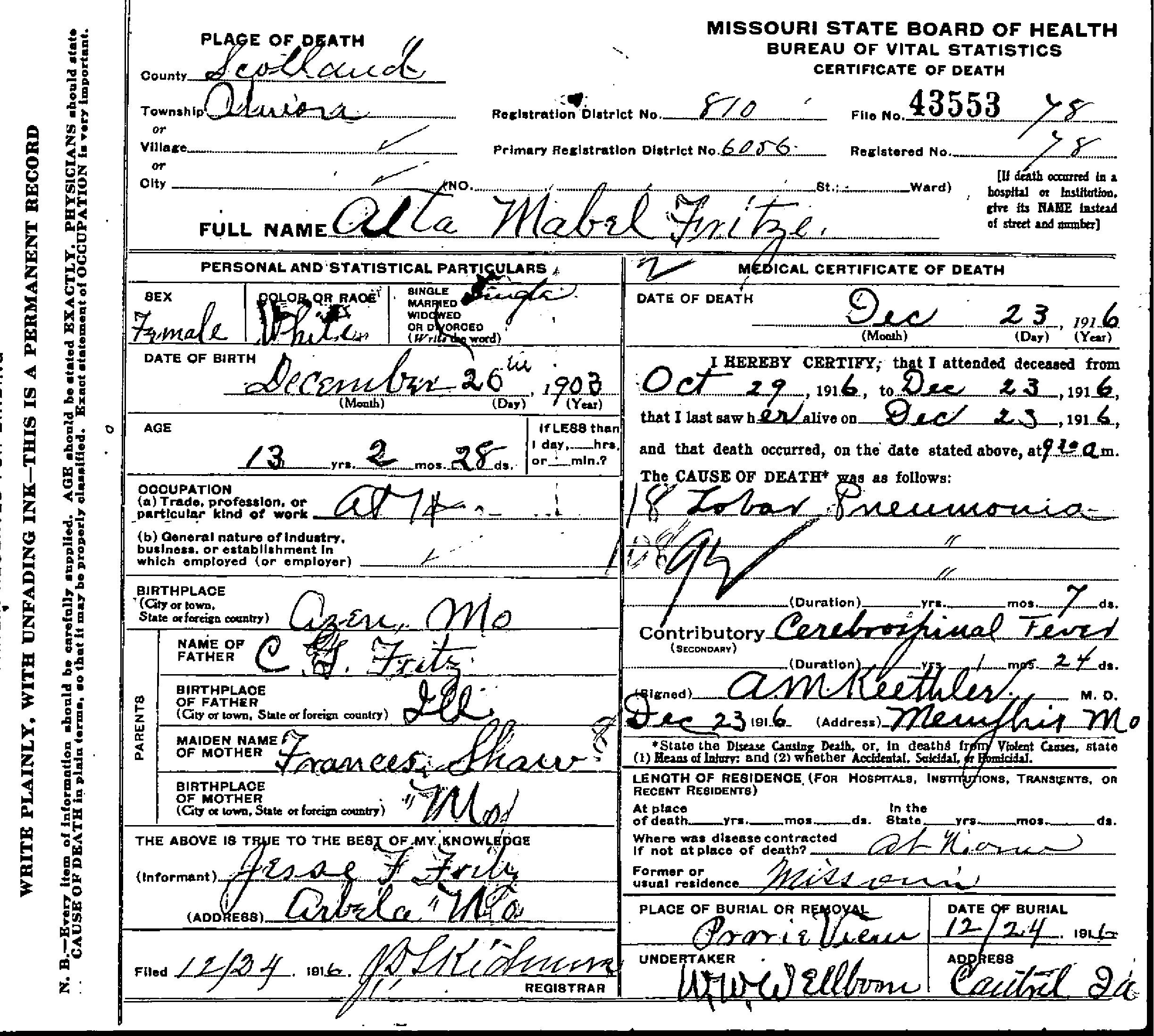 Ancestry.com Operations, Inc., Web: Missouri Death Certificates 1910-1962, Scotland County certificate 1916-043553, Alta Mabel Fritze; Database online, Ancestry.com LLC, Ancestry.com : 2015 (http://www.Ancestry.com/ : accessed 09/16/2019); citing Missouri Death Certificates, Missouri Secretary of State, Missouri Digital Heritage, Database and images [Surety: 3]. |