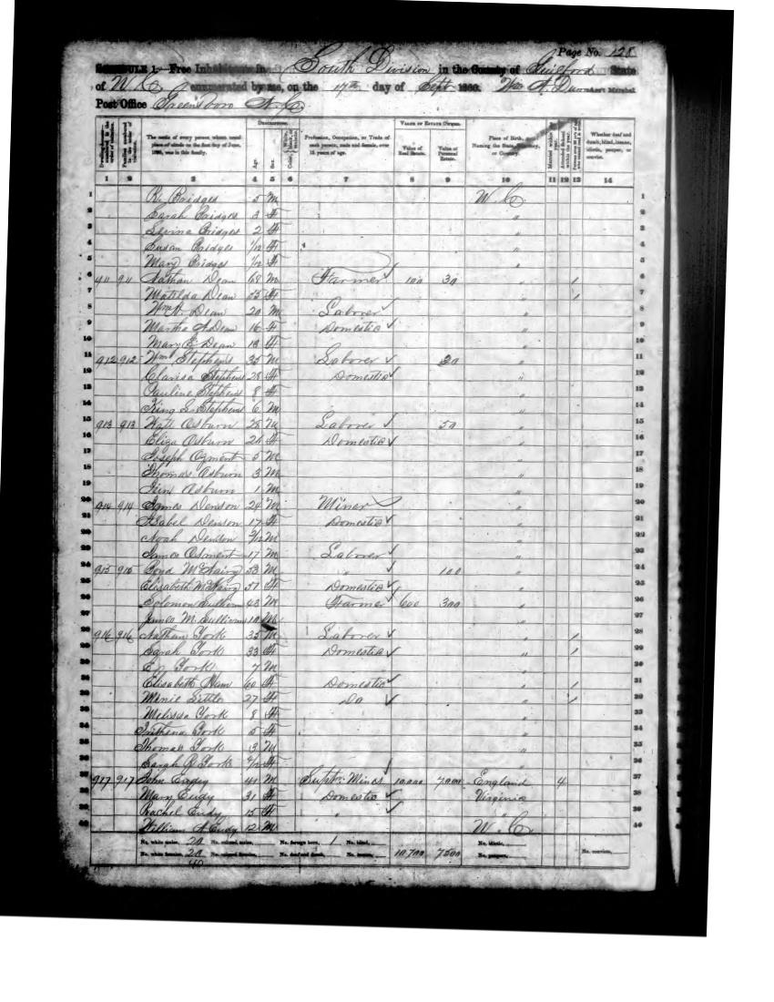 Ancestry.com Operations, Inc., 1860 United States Federal Census, South Division, Guilford County, NC, page 128, dwelling 911, family 911, line 10, Mary E Dean; Database and images, Ancestry.com LLC, Ancestry.com : 2009 (http://www.Ancestry.com/ : accessed 12/26/2019); citing Eighth Census of the United States, 1860 U. S. Census, population schedules, National Archives and Records Administration Microfilm Publication M653 (1438 rolls), Records of the Census Bureau, Record Group 29, National Archives, Washington, DC, roll 900, image 132 [Surety: 3]. |