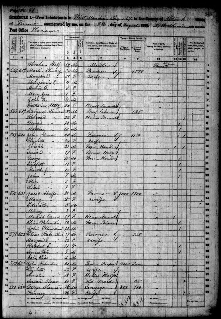 Ancestry.com Operations, Inc., 1860 United States Federal Census, West Manheim, York, PA, page 81, dwelling 571, family 622, line 33, Syrus Van Rabenstine; Database and images, Ancestry.com LLC, Ancestry.com : 2009 (http://www.Ancestry.com/ : accessed 04/25/2020); citing Eighth Census of the United States, 1860 U. S. Census, population schedules, National Archives and Records Administration Microfilm Publication M653 (1438 rolls), Records of the Census Bureau, Record Group 29, National Archives, Washington, DC, roll 1201, image 89 [Surety: 3]. |