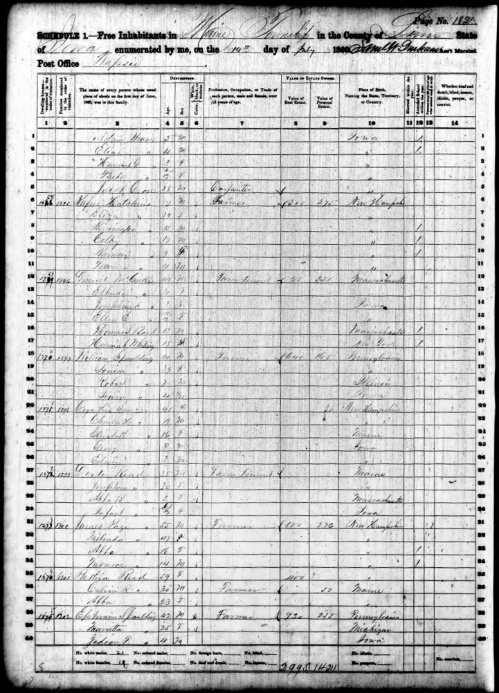 Ancestry.com Operations, Inc., 1880 United States Federal Census, ED 269, Maine, Linn, IA, page 19, dwelling 180, family 182, line 47, Mccrellis, Ellen E; Database and images, Ancestry.com LLC, Ancestry.com : 2010 (http://www.Ancestry.com/ : accessed 08/15/2021); citing Tenth Census of the United States, 1880 U. S. Census, population schedules, National Archives and Records Administration Microfilm Publication T9 (1454 rolls), Records of the Bureau of the Census, Record Group 29, National Archives, Washington, DC, roll 351, image 542 [Surety: 3]. |