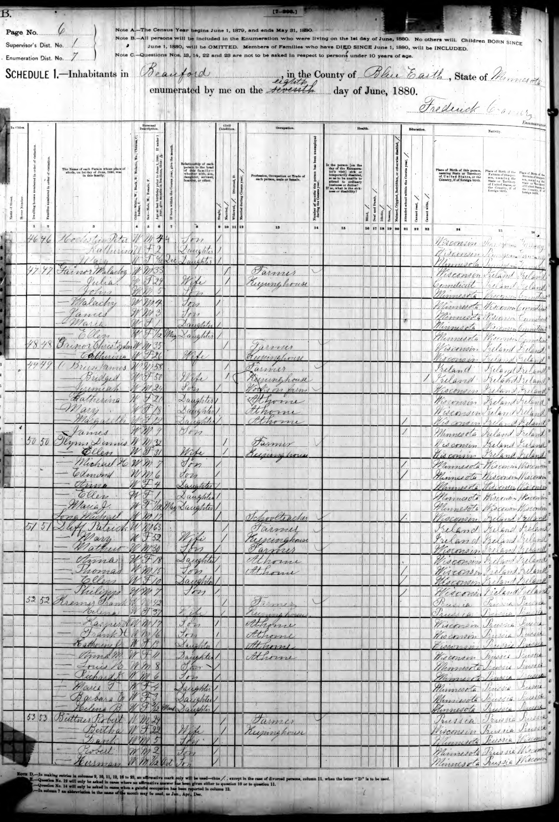 Ancestry.com Operations, Inc., 1880 United States Federal Census, ED 7, Beauford, Blue Earth, MN, page 6, dwelling 53, family 53, line 49, Büttner, Robert; Database and images, Ancestry.com LLC, Ancestry.com : 2010 (http://www.Ancestry.com/ : accessed 11/09/2024); citing Tenth Census of the United States, 1880 U. S. Census, population schedules, National Archives and Records Administration Microfilm Publication T9 (1454 rolls), Records of the Bureau of the Census, Record Group 29, National Archives, Washington, DC, roll 615, image 645 [Surety: 3]. |