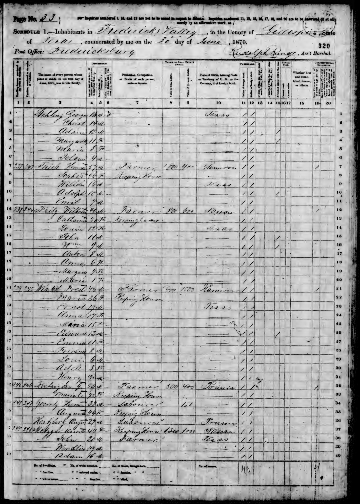 Ancestry.com Operations, Inc., 1870 United States Census, Frederick Valley, Gillespie, TX, page 33, dwelling 238, family 244, line 14, Fritz, Louisa; Database and images, Ancestry.com LLC, Ancestry.com : 2009 (http://www.Ancestry.com/ : accessed 01/02/2025); citing Ninth Census of the United States, 1870 U. S. Census, population schedules, National Archives and Records Administration Microfilm Publication M593 (1761 rolls), Records of the Bureau of the Census, Record Group 29, National Archives, Washington, DC, roll 1587, image 36 [Surety: 3]. |